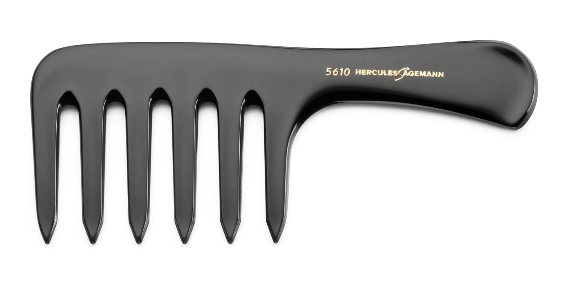 Sehr grob gezahnter Griffkamm aus Ebonit, ideal für lockiges und dickes Haar.