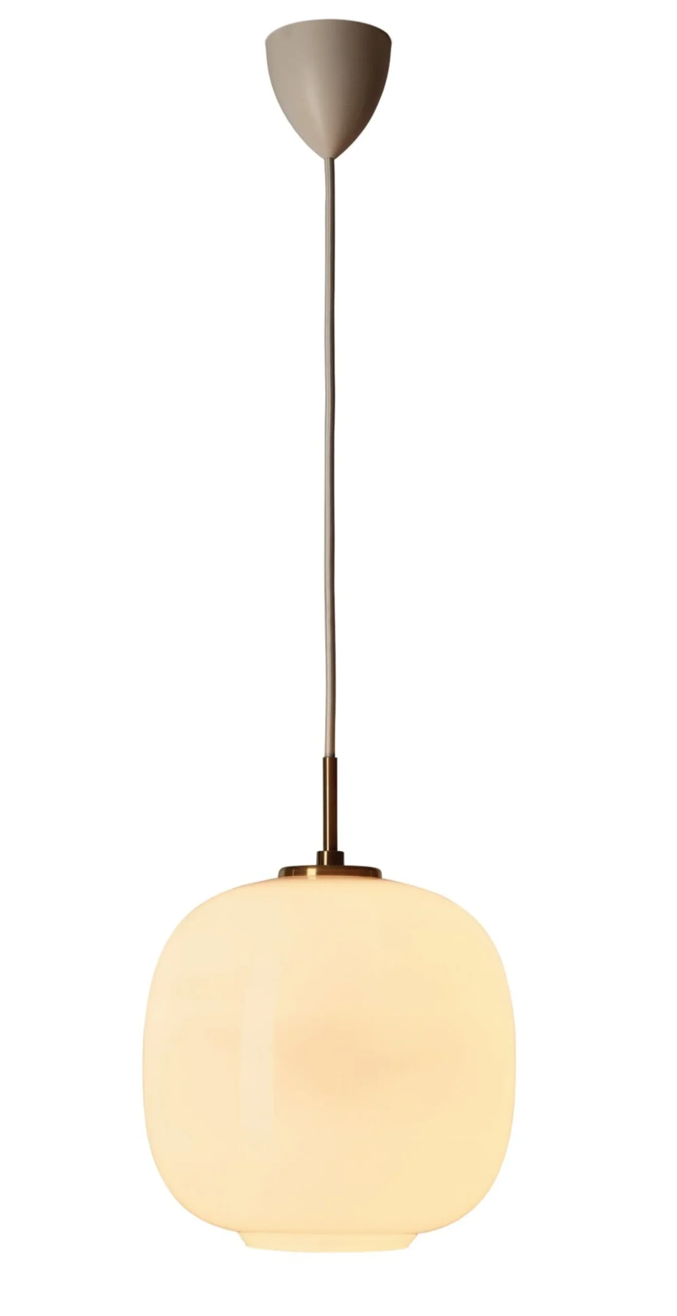 Schirm mundgeblasenes Opalglas weiß, Pendelrohr Messing gezogen. Kunststoffbaldachin. Textilkabel, Länge 4,2 m. Lieferung ohne Leuchtmittel.