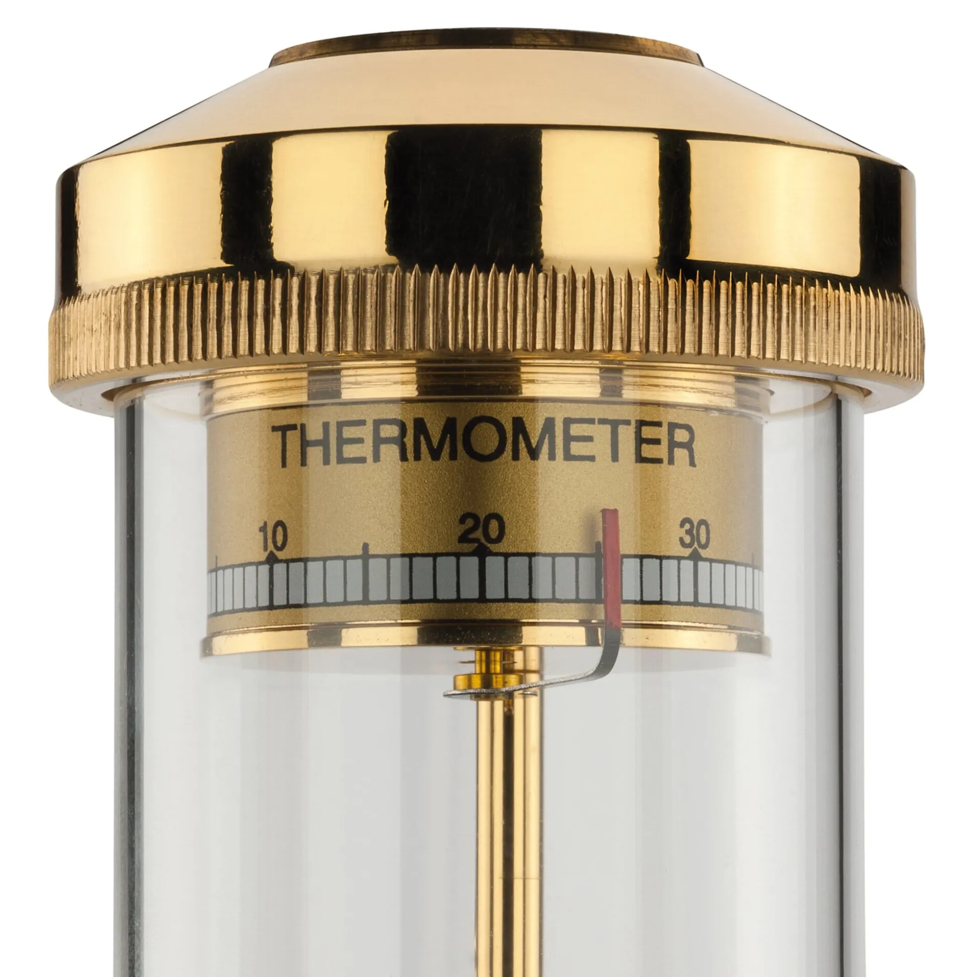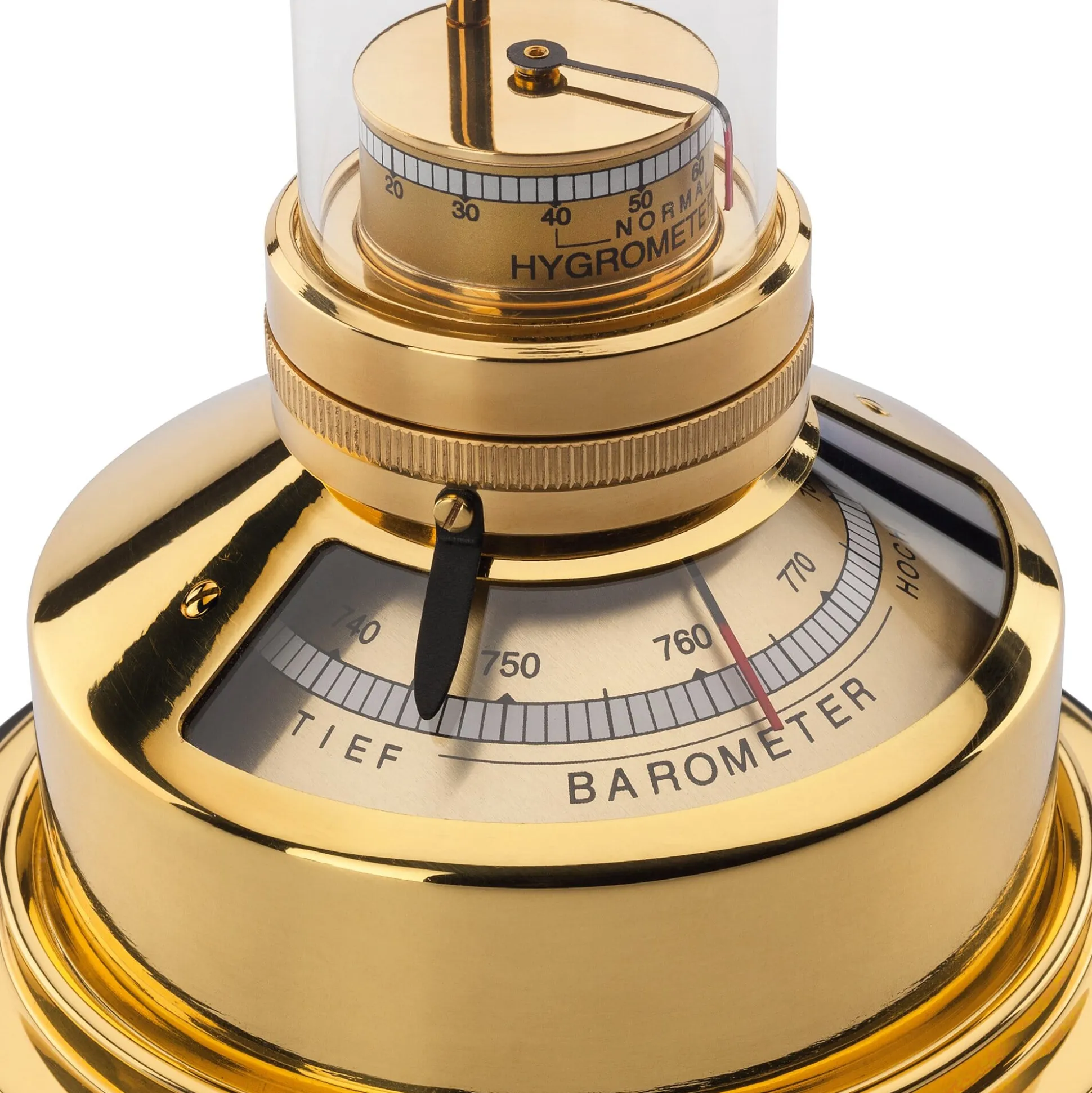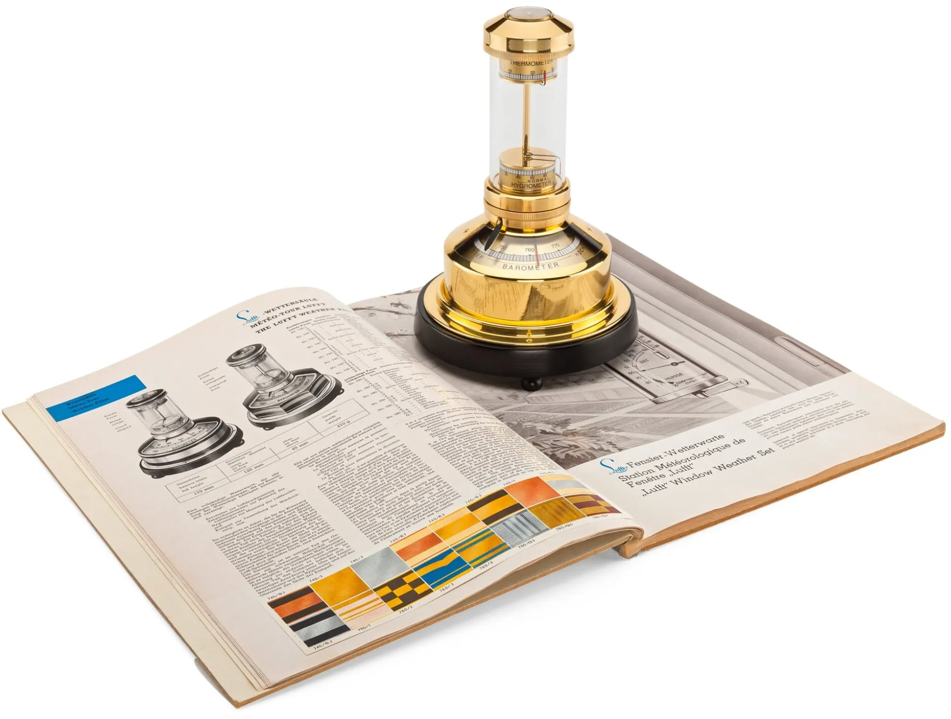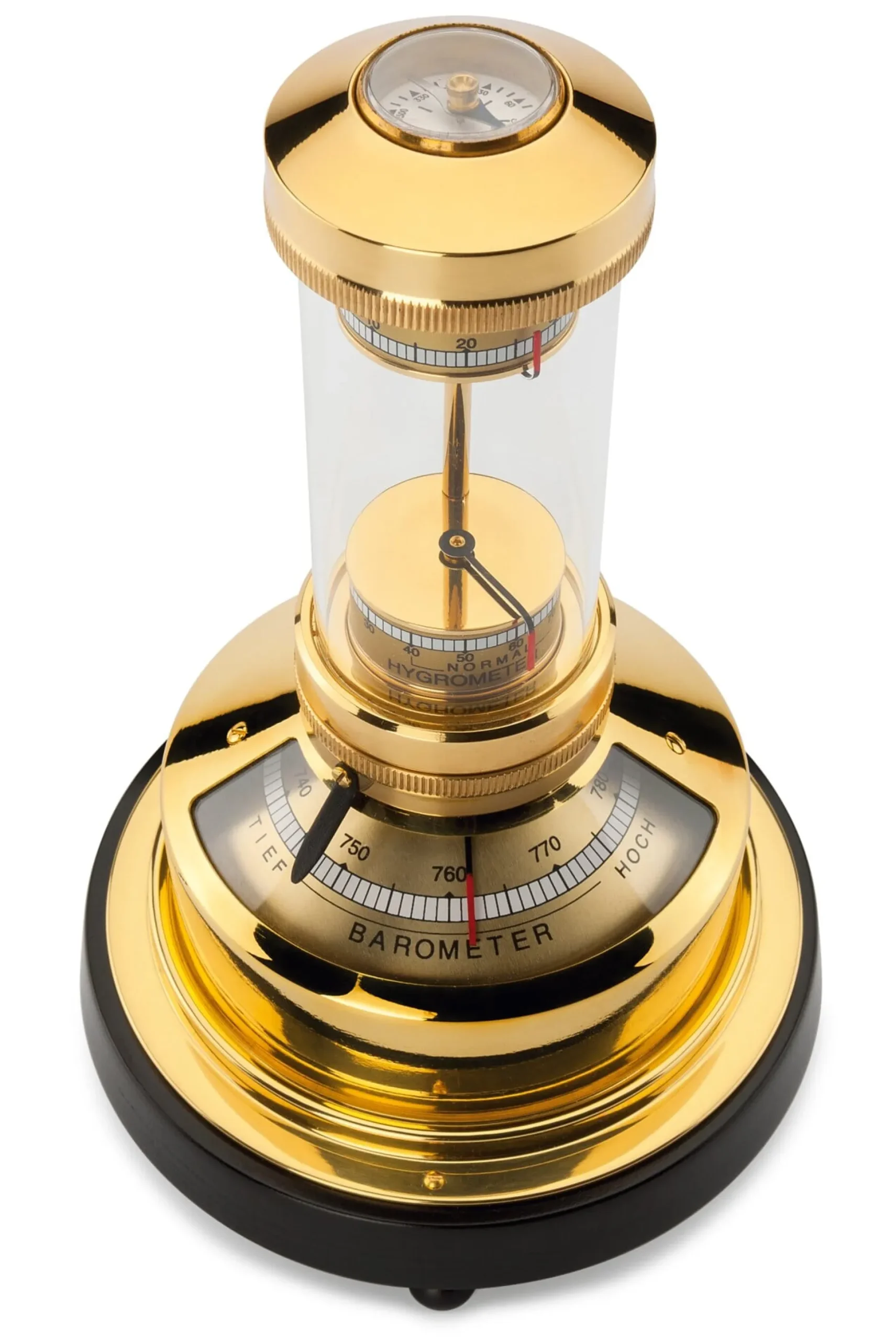 Mit Barometer (Messbereich 740 bis 780 Torr), Hygrometer (Messbereich 0 bis 100%), Thermometer (Temperaturbereich -18 bis +58 °C) und Kompass. Messing, poliert und klarlackiert, Buchenholz, schwarz gebeizt und klarlackiert, Glas.
