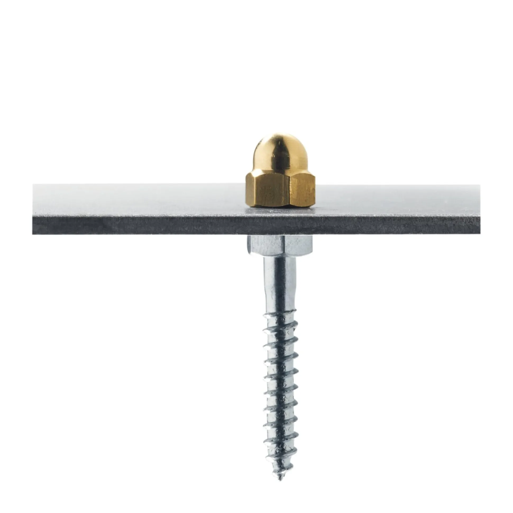 Magnetleiste aus Rohstahl. Sie wird mittels Stockschrauben in einem durch eine Sechskantmutter einstellbaren und eventuelle Wandunebenheiten ausgleichenden Abstand an die Wand gebracht. Hutmuttern sichern sie (solche aus Stahl und solche aus Messing zur wahlweisen Verwendung liefern wir mit).