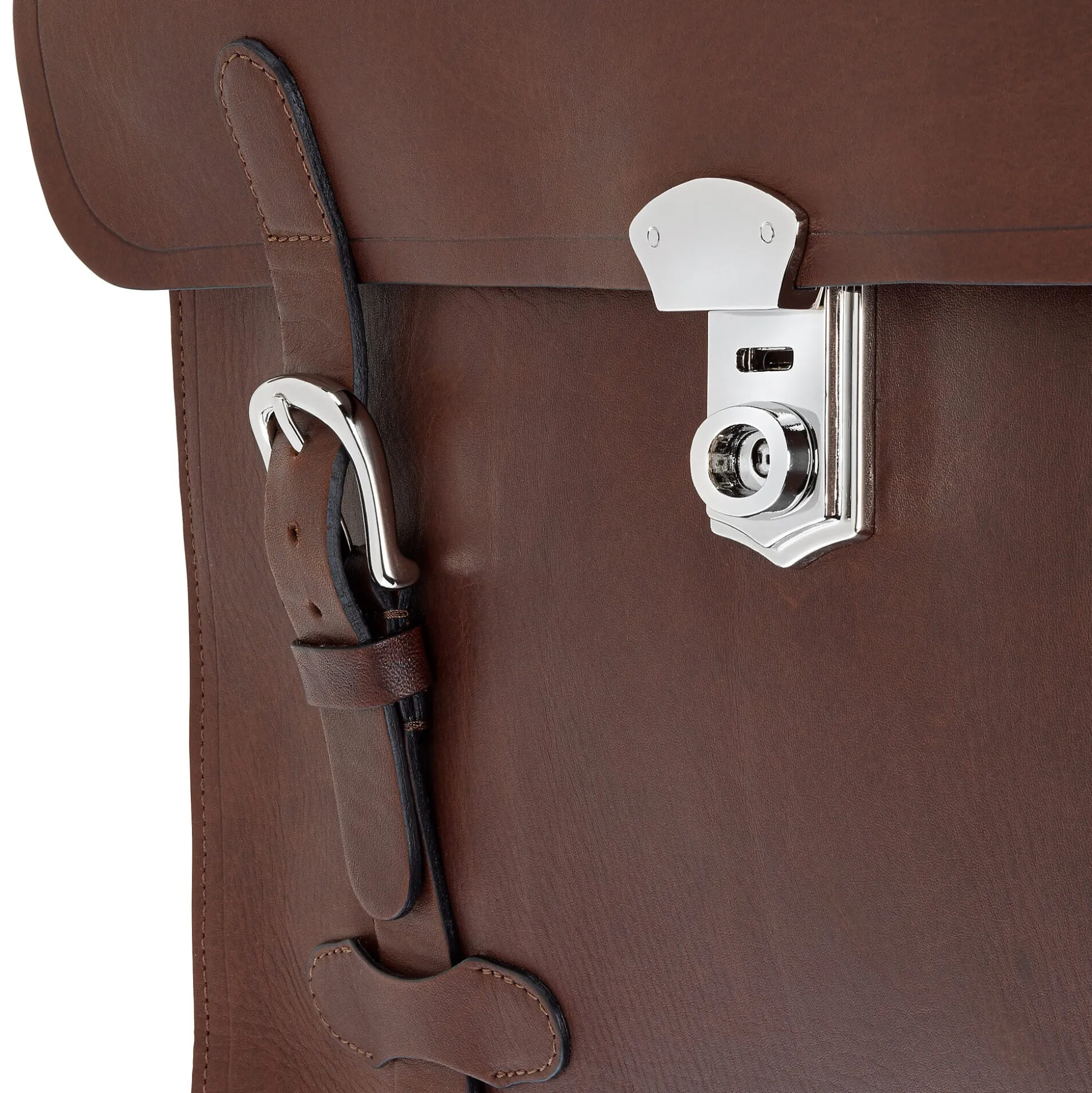 Die Nähte sind offenkantig verarbeitet, die Lederkanten mit einem sehr dünnen, umlaufenden Reifelstrich versehen. Diese kaum noch angewandte Sattlertechnik, bei der ein heißes Streicheisen – freihändig über das Leder gezogen – die Kanten belastbarer macht, ist erkennbar an einer feinen Linie, auf der das Leder durch die Temperatureinwirkung gedunkelt ist. Die Griffe sind aus Vollleder, was einen handgreiflichen Qualitätsunterschied ausmacht. Beschläge und Schließen der Taschen kommen aus Italien. Die Schlösser sind aus Zamak, die Schließen selbst aus Messing, jeweils glänzend vernickelt.