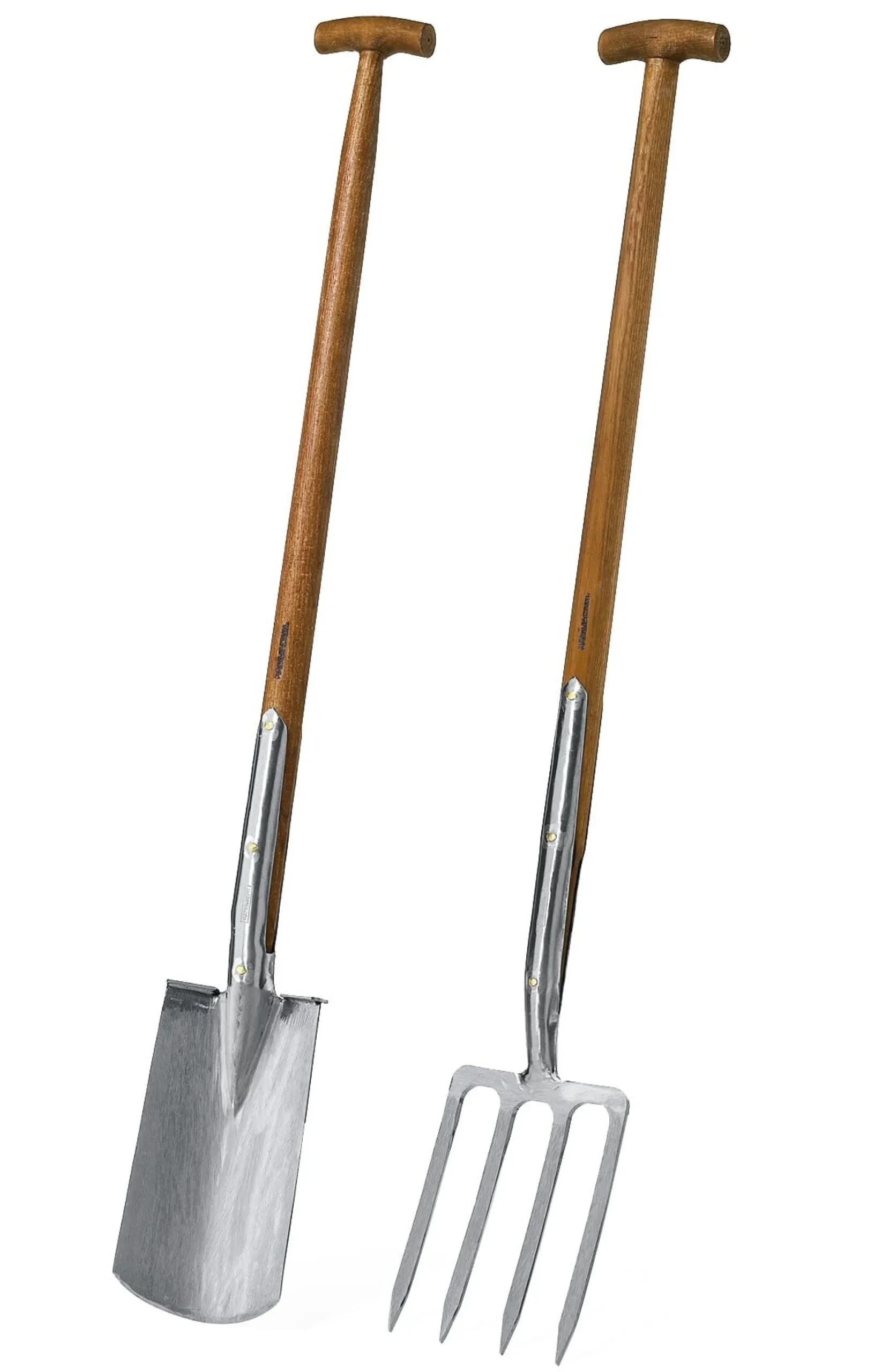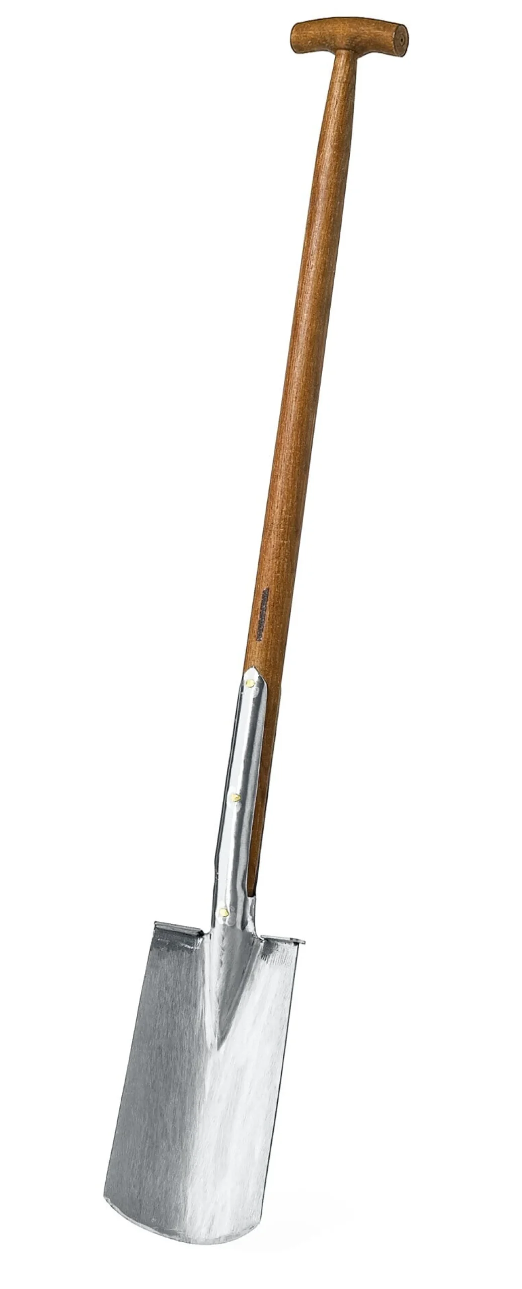 In der klassischen Form des „englischen Gartenspatens“. Neben vielen anderen Nutzungsmöglichkeiten ist der Spaten unersetzlich, um Stauden zu teilen, große Pflanzlöcher auszuheben, Beetkanten abzustechen oder bisher ungenutzte Flächen urbar zu machen.