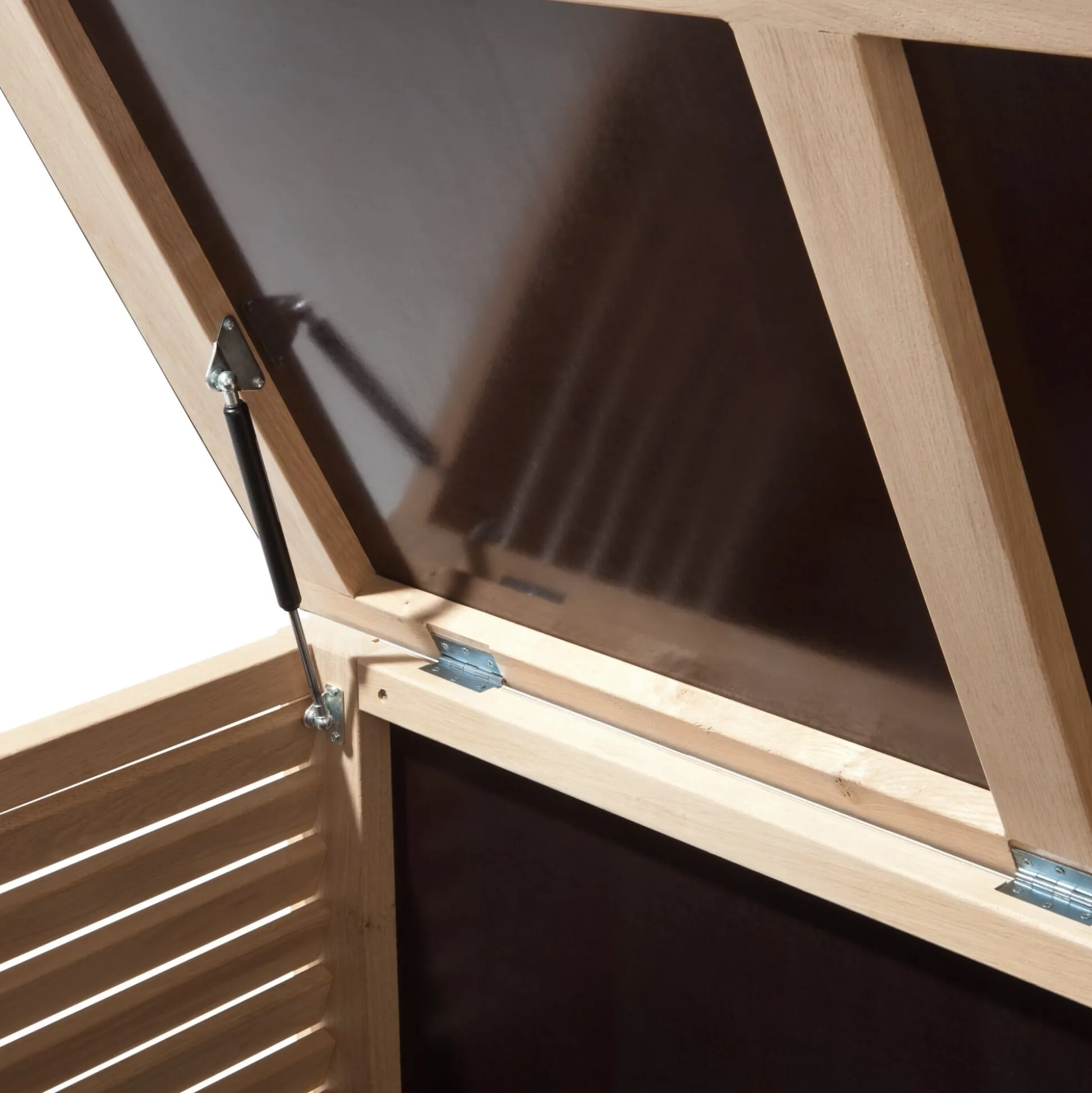 Ein schönes, massives Möbel, das in seinem geräumigen Inneren den Sommer über die Sitzauflagen Ihrer Gartenmöbel aufnimmt. Oder Sandkastenpielzeug, Federballschläger, Bollerwagen und das rote Rutschauto, Wäscheklammern und Teppichklopfer, Gartengerätschaften, Werkzeuge – und vielleicht auch noch Holzkohle und Grillzubehör. Front und Seitenteile der Truhe sind aus unbehandeltem Eichenholz gefertigt, Boden und Rückwand aus feuchtebeständiger Siebdruckplatte. Der Deckel ist in Rahmenbauweise gearbeitet und mit einer Auflage aus Zinkblech belegt; zwei Gasdruckdämpfer halten ihn im geöffneten Zustand oben und sorgen durch ihre abbremsende Wirkung für ein sanftes Schließen. Er ist so stabil, dass die Truhe problemlos auch als Sitzgelegenheit genutzt werden kann. Die seitlich eingearbeiteten, offenen Lamellen gewährleisten eine gute Durchlüftung des Truheninneren – sie bedingen aber auch, dass das Möbel nicht wasserdicht ist. Beachten Sie dies bitte bei der Aufstellung der Truhe bzw. auch bei der Auswahl des Lagerguts.