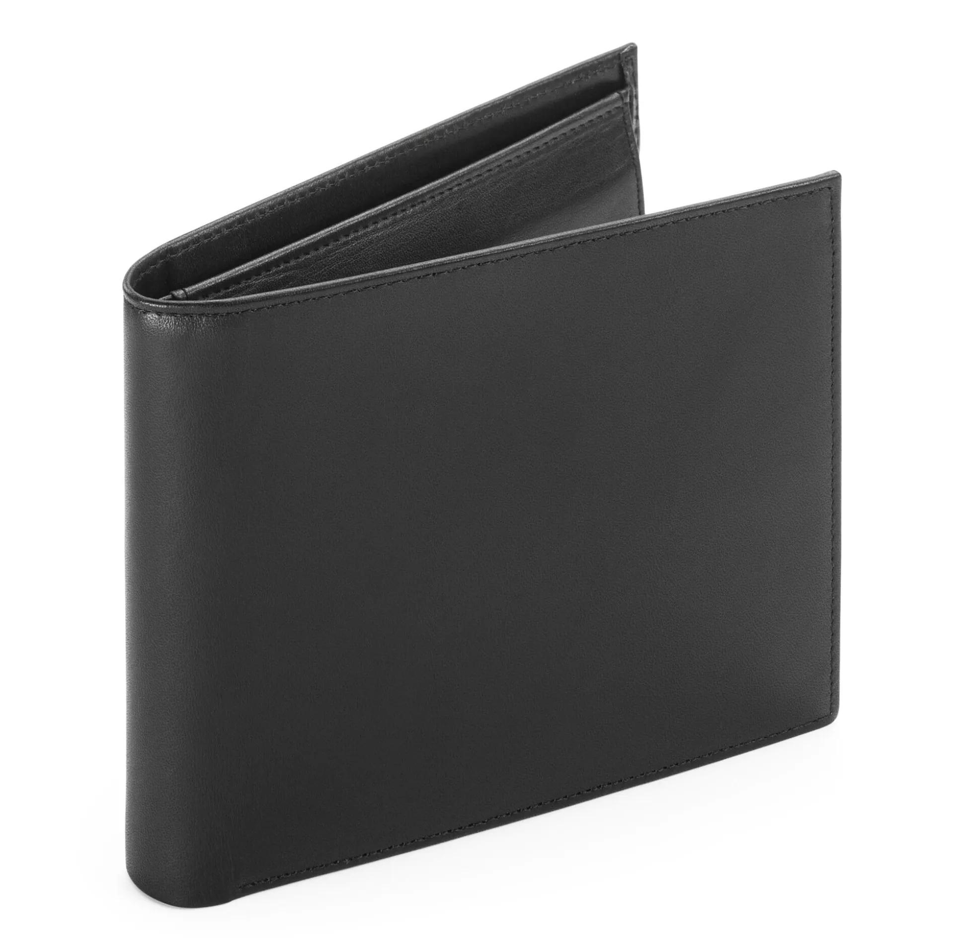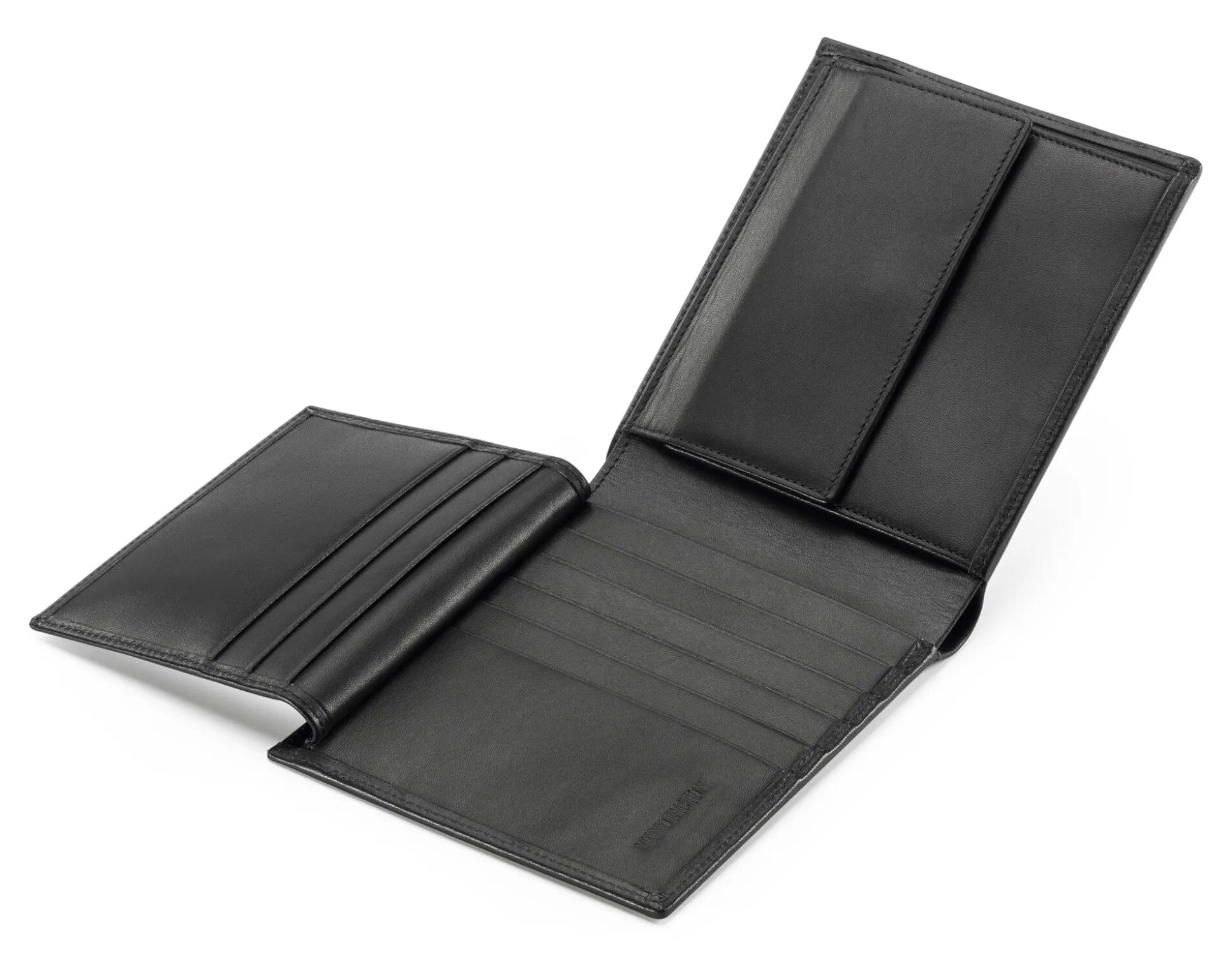 Ein klassisches Herrenportemonnaie mit fünf Kartenfächern, die ein Überschlag – mit drei weiteren Kartenfächern – schützt. Mit zwei Geldscheinfächern und einem langen Fach hinter den Kreditkartenfächern, das zum Beispiel Platz für den Kfz-Schein bietet. Mit Leder ausgeschlagenes Münzfach. Rindleder (Stärke 1,6–1,8 mm), vegetabil gegerbt, Herkunft Deutschland. Hergestellt in Tschechien. Breite 12 cm, Höhe 10 cm. Gewicht 95 g.