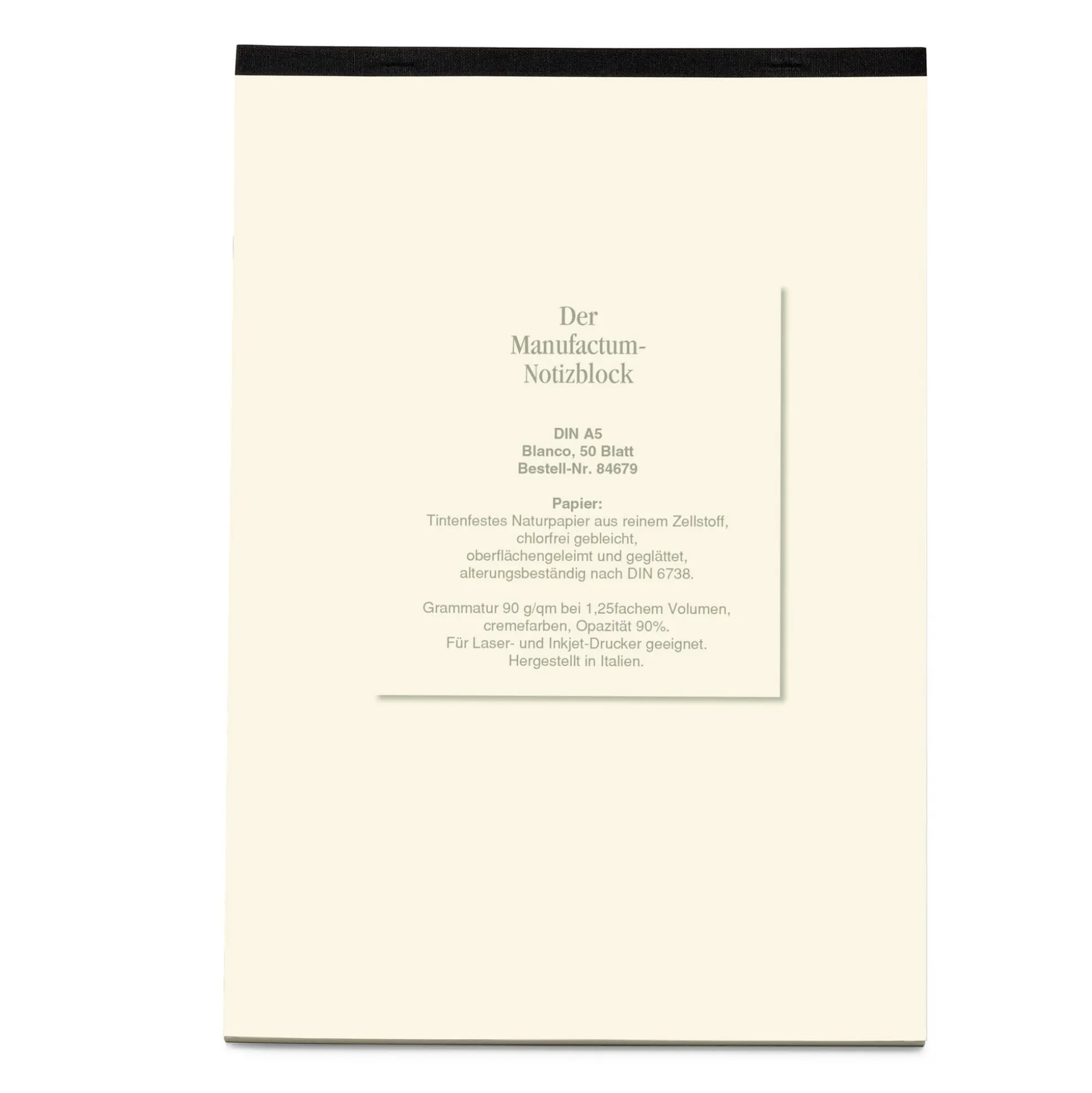 50 Blatt mit Mikroperforation, beidseitig bedruckt, Blattgröße DIN A5. Geleimt, zweifach geklammert und mit schwarzem Leinen gefälzelt. Grammatur 90 g/qm. 22,3 × 14,8 cm.
