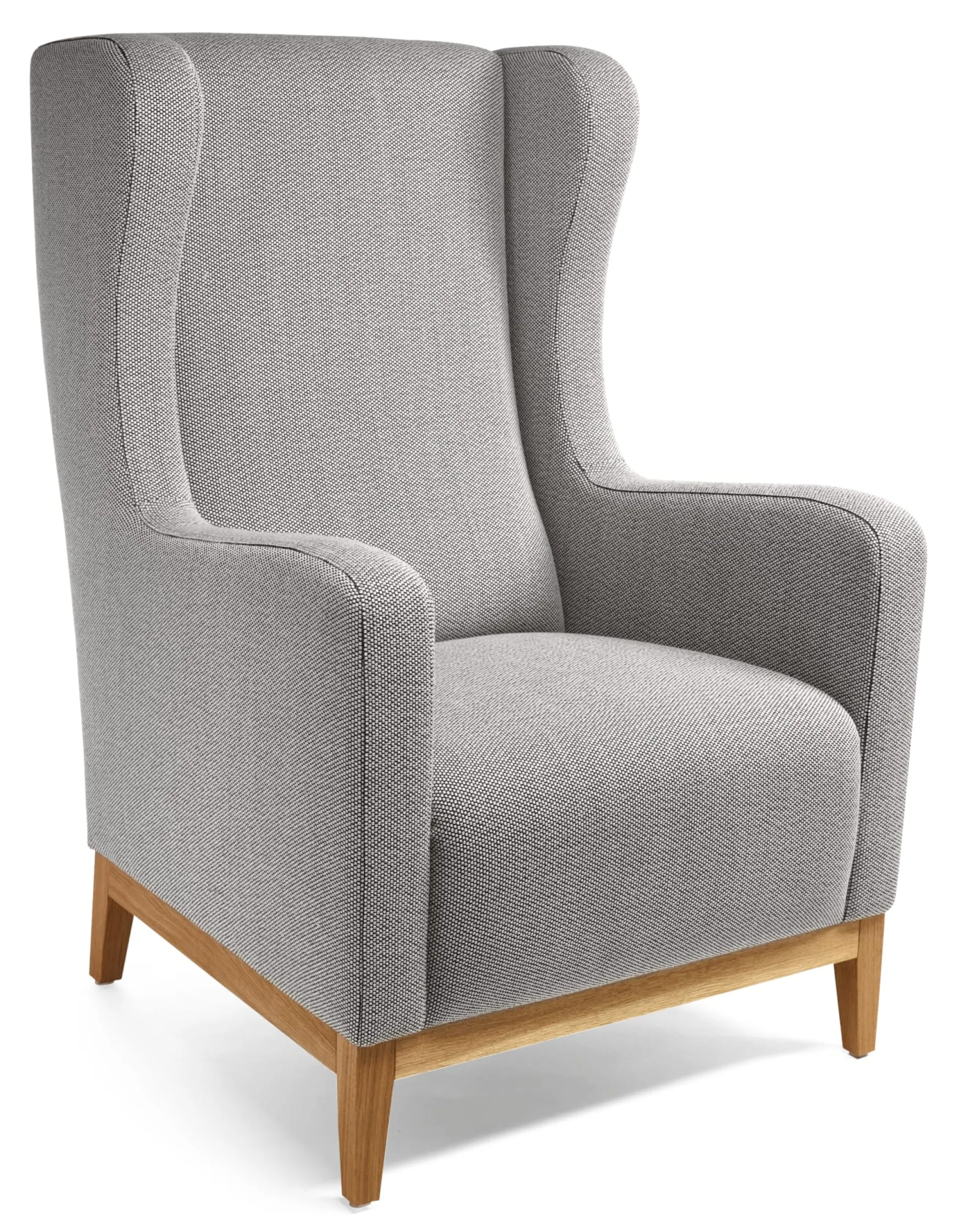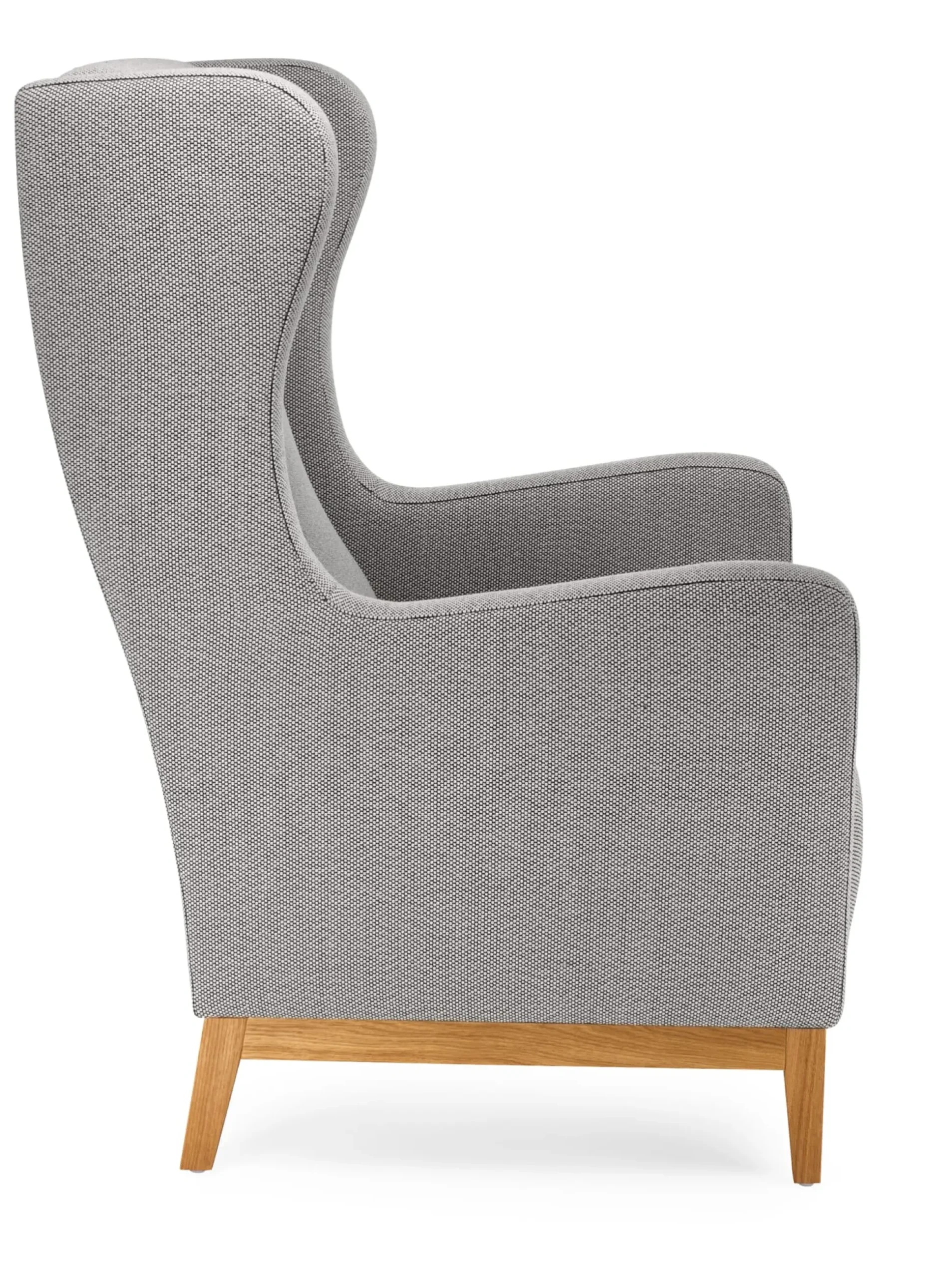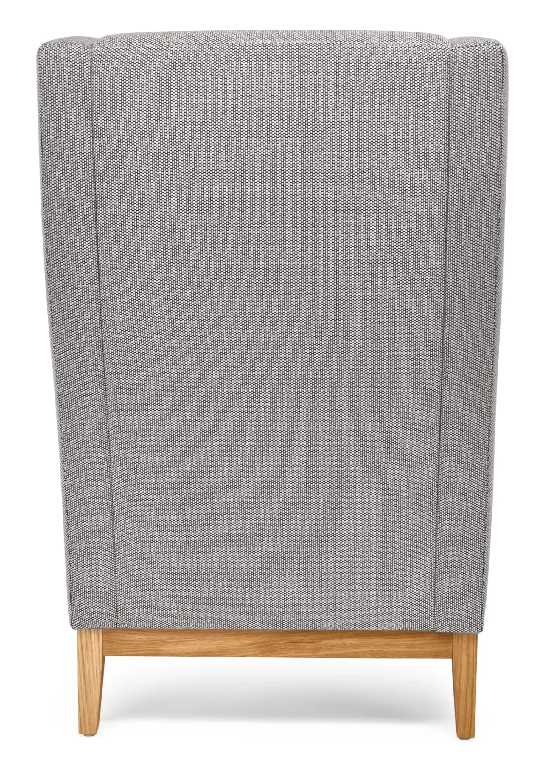 Bezug Schurwolle. Gestell Buchenholz, Füße Eichenholz (Herkunft Deutschland). Kunststoffgleiter sind montiert, vier Filzgleiter liegen bei. Handwerkliche Federung mit Wellenfedern, Filz sowie einem Zylinderfederkern aus verkupfertem Stahldraht. Zwei Lagen Kaltschaum auf Federleinen und latexierter Kokosfaser. Hergestellt in Deutschland. Höhe 110 cm, Breite 72 cm, Tiefe 78 cm. Sitzhöhe 45 cm. Gewicht 33 kg.