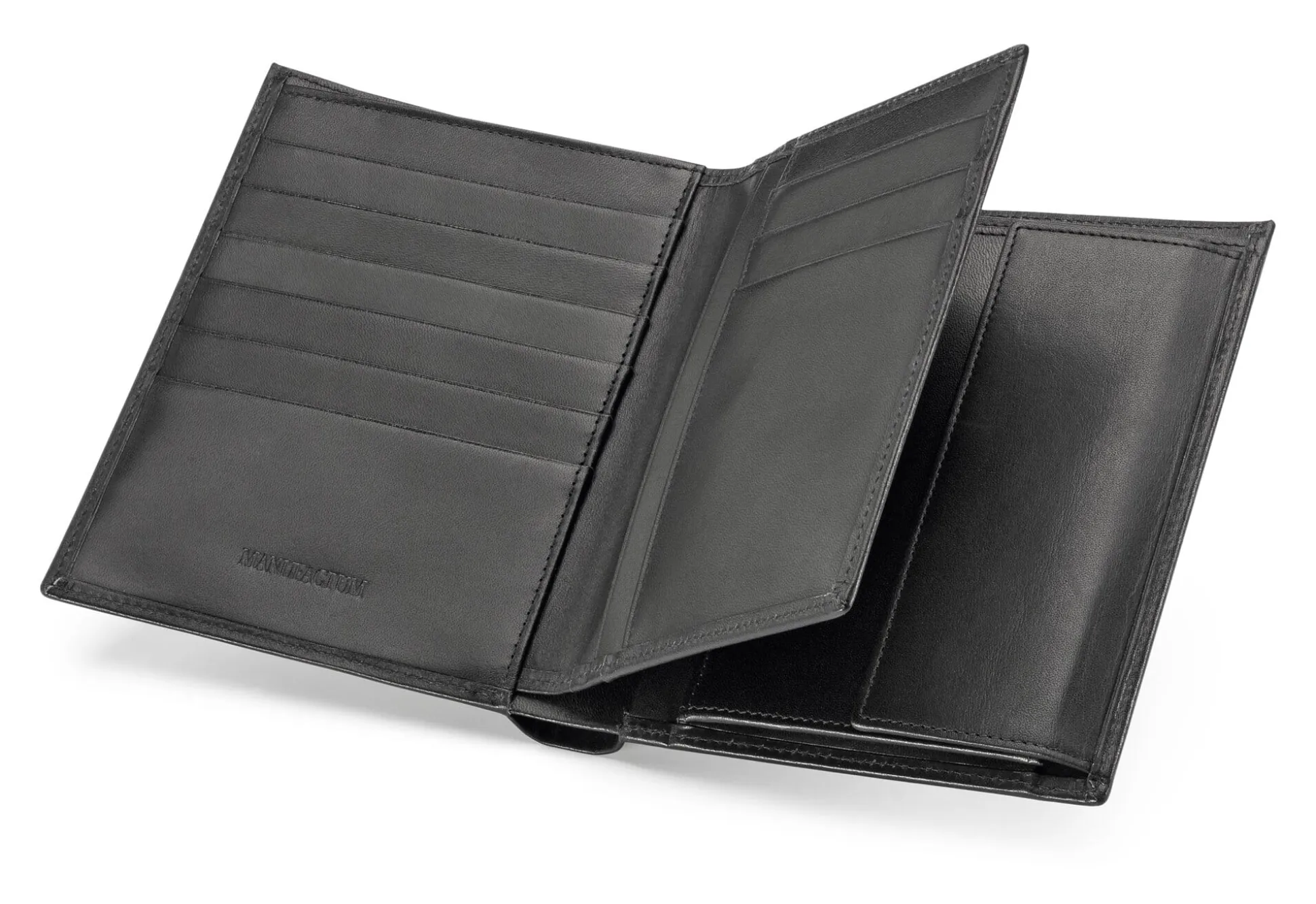 Die hochformatige Kombi-Geldscheinbörse ist mit zwei großen Geldscheinfächern und einem ledergefütterten Fach für Hartgeld ausgestattet. Unter Letzterem befinden sich zwei weitere Fächer für Ausweise. In der Innenklappe lassen sich links sechs Karten mitführen, rechts drei Kreditkarten und zwei Ausweise. Vier Ausweise haben im äußeren Klappenteil Platz, weitere Papiere im großen Extrafach hinter der Innenklappe.