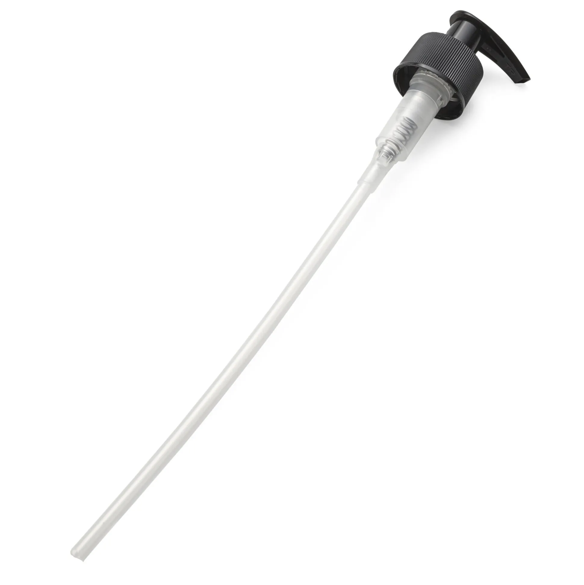 Pumpmechanik aus Edelstahl. Kopf aus PP, Länge 8,5 cm, Breite 4 cm. Schlauch aus PE-LD, Ø 6 mm, Länge 18,5 cm. Gewicht 13 g. Ohne Flasche.