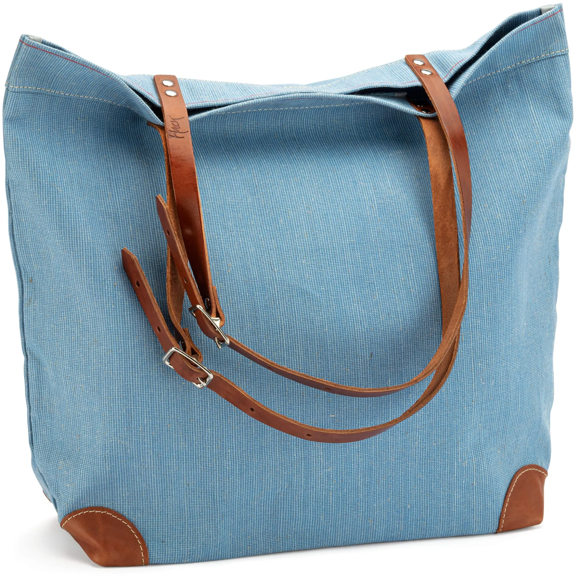 Das Segeltuch wird aus Halbleinen in einer sehr dichten, zweifädigen Panamabindung gewebt, was den Stoff nahezu unverwüstlich macht. Die aus 4 mm starkem, vegetabil gegerbtem Geschirrleder gefertigten Trageriemen sind ein extrem tragfähiges und ein haltbares Pendant zum belastbaren Stoff. Dank der verstellbaren Länge können die Taschen in der Hand, aber auch über der Schulter getragen und individuell angepasst werden. An den Ecken des Taschenbodens – also den besonders beanspruchten Stellen – wurden die Taschen mit Besätzen aus Rindveloursleder verstärkt. Schon die kleine Tasche nimmt erhebliche (Einkaufs-)Mengen auf, in der großen Markttasche finden durch die funktionale rechteckige Form auch Stangengemüse und Baguettes Platz. Und selbst für den Wocheneinkauf auf dem Markt bietet sie ausreichend Stauraum. Auch als Strand- oder Sporttasche ist das große Modell geeignet, und einige Manufactum Mitarbeiterinnen behaupten nach Trageversuchen hartnäckig, sie sei auch eine probate großvolumige Handtasche und zum profanen Verstauen von Einkäufen fast zu schade. Für mehr Ordnung im Inneren sorgen bei Bedarf separat erhältliche Aufräumer aus Segeltuch.