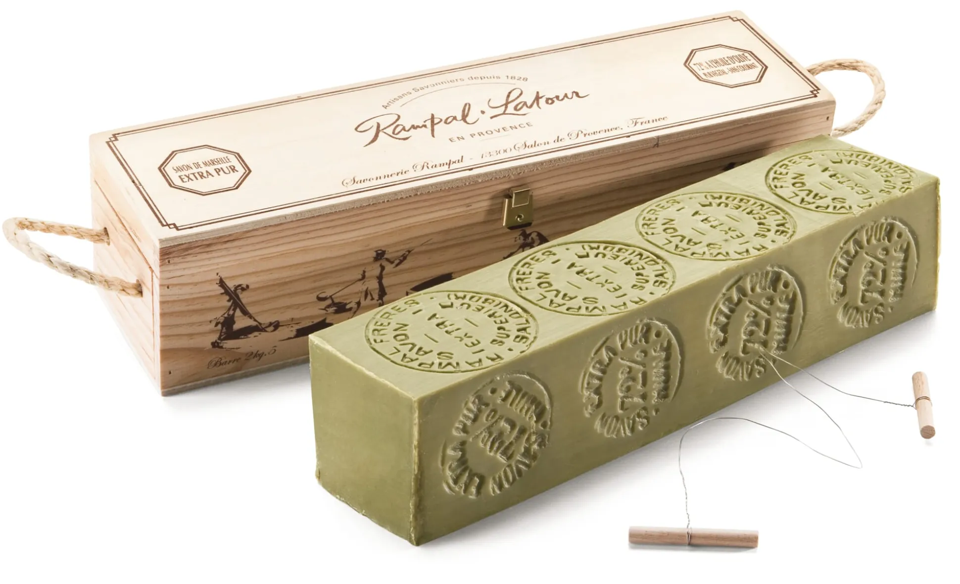 Feste Olivenölseife in einer Holzkiste mit einem Schneidedraht zum Portionieren. Hergestellt in Frankreich.