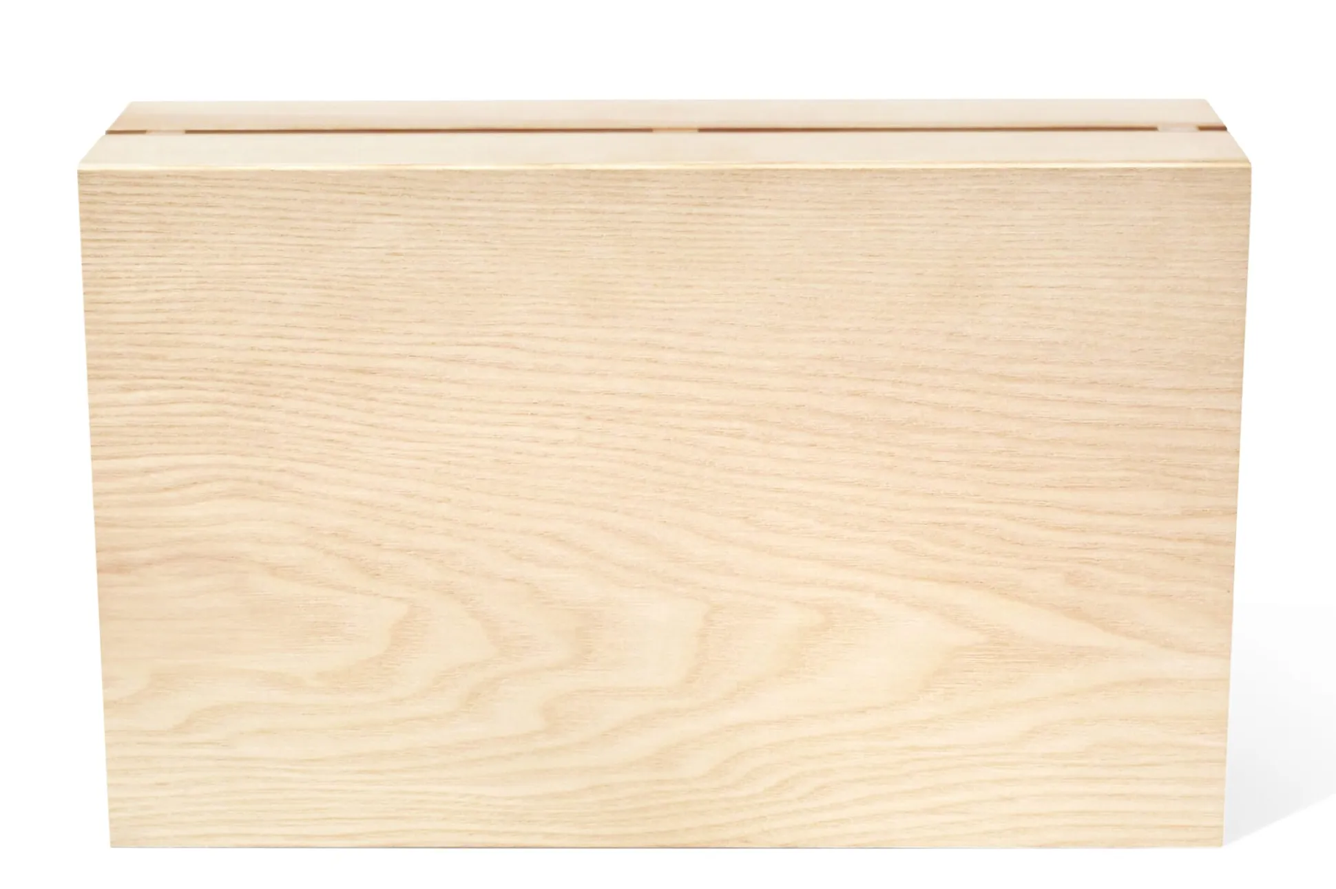 Zwei Blöcke aus Massivholz, auf Distanz gesetzt, bilden die Basis für einen standfesten Messerblock. Flach nebeneinander aufgereiht finden hier 6 bis 8 Messer ihren Platz. Sicher aufbewahrt, geschützt vor unbefugter Kinderhand und messerschonend im gleichen Maße. Nutzbar für Messer mit einer Klingenlänge von maximal 21,5 cm.