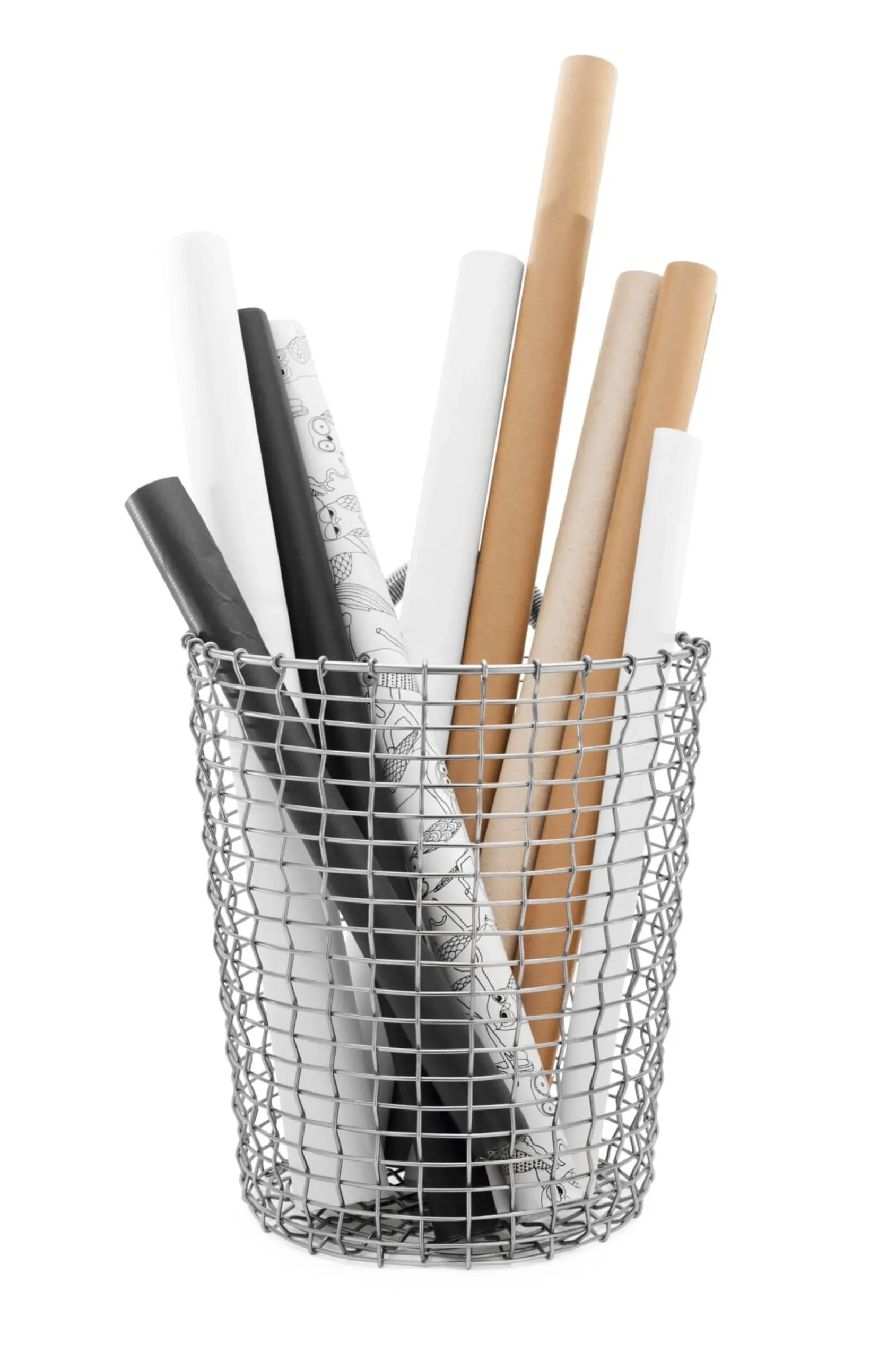 Robuste, handgeflochtene Stahlkörbe aus Schweden. Ursprünglich wurden diese unverwüstlichen und schönen Behälter aus feuerverzinktem Stahldraht in der Fischerei und im Gartenbau genutzt. Der verwendete feuerverzinkte Stahldraht hat eine mattgraue Oberfläche, die ihn vor Korrosion bewahrt. Die Technik des Feuerverzinkens wird seit über 150 Jahren verwendet, um Stahl vor Witterungseinflüssen, Wind und Abnutzung zu schützen.