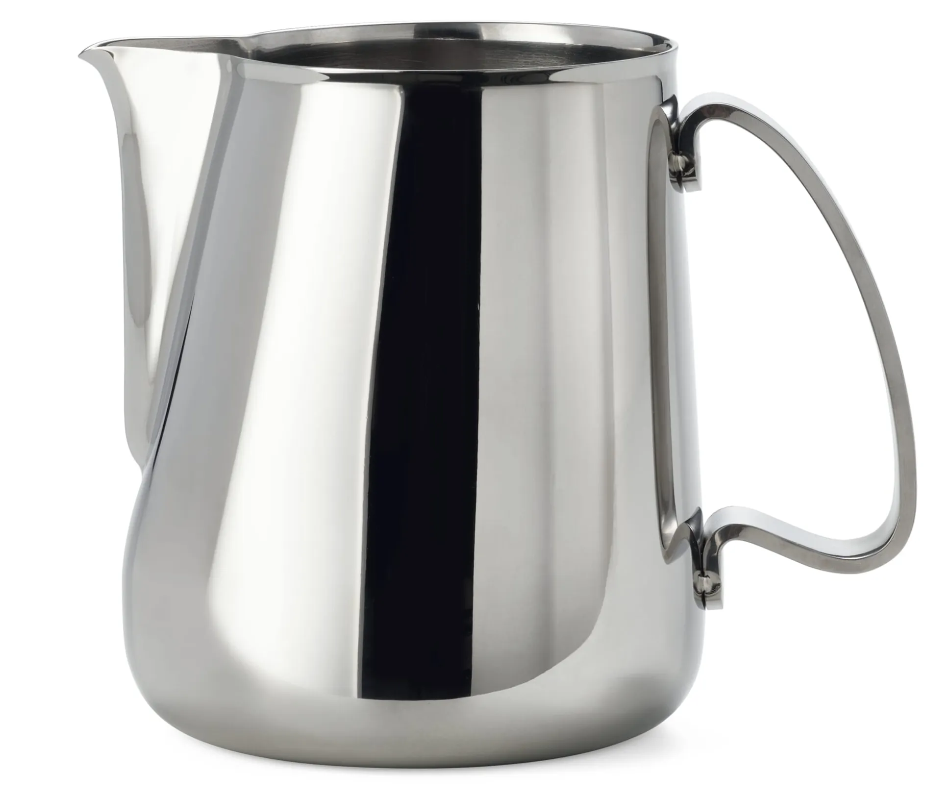 Italienische Baristas schätzen dieses Kännchen aus zwei Gründen sehr. Vor allem die Form der abgerundeten Schnaupe ist von Vorteil, die vollflächig ein wohldosiertes, tropffreies Ausgießen ermöglicht – so, dass die geschäumte Milch noch über die Seite leicht zu einem kleinen Kunstwerk in die Tasse gegossen werden kann. Zugleich sorgen die Beschaffenheit des Kännchenbodens und die ordentliche Wandstärke dafür, dass sich beim Erwärmen und Aufschäumen der Milch mit der Dampflanze der Barmaschine die Temperatur kontrolliert steuern lässt. Für das Ergebnis ist dieser zweite Faktor ebenso entscheidend, da die Flüssigkeit, wenn sie zu rasch erhitzt wird, nicht gut zu einem regelmäßigen Schaum aufgebaut werden kann.