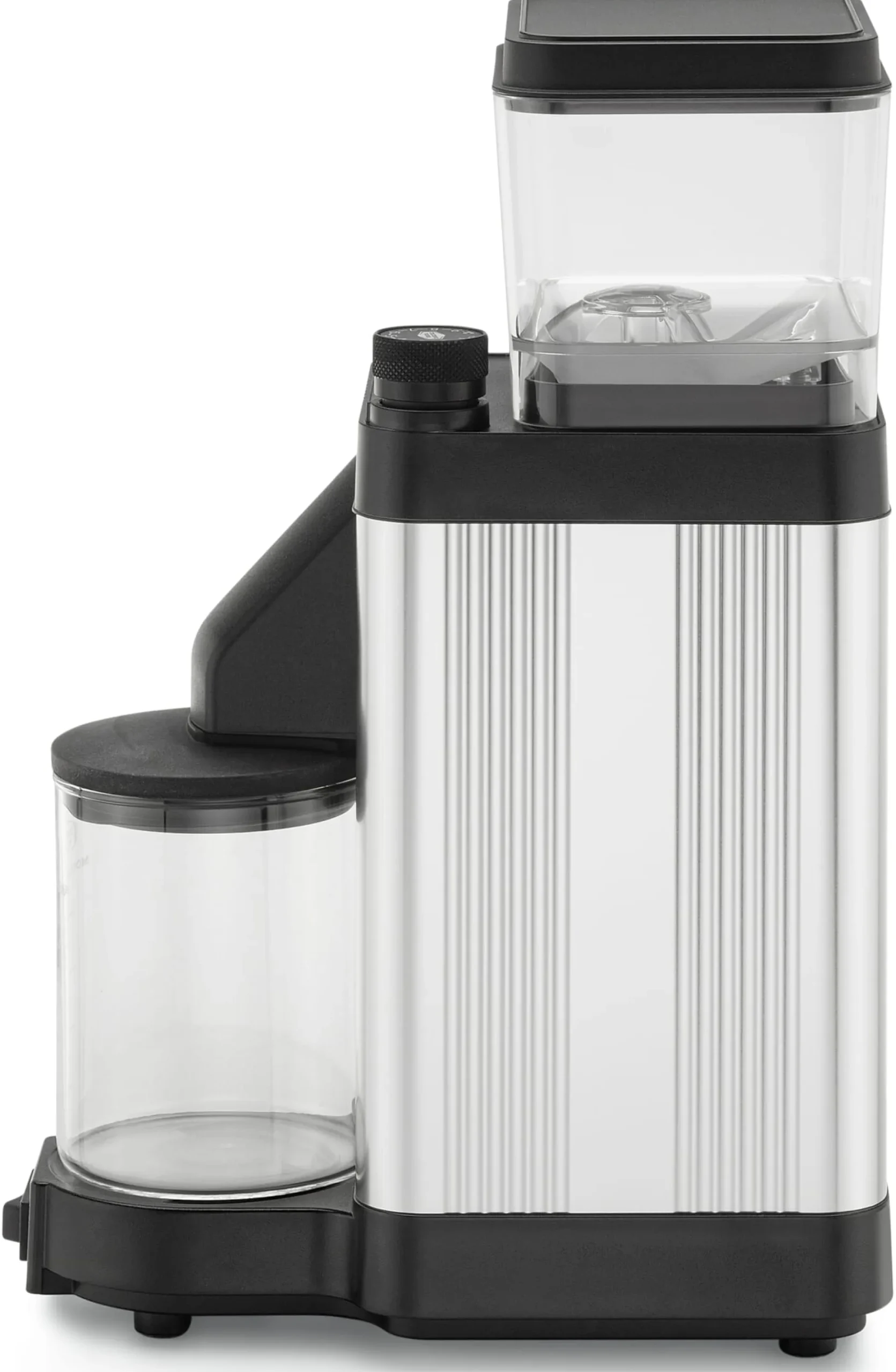 Elektrische Filterkaffeemühle. Aluminiumgehäuse. Bohnenbehälter aus Kunststoff (Fassungsvermögen 675 ml). Kaffeemehlauffangbehälter aus Glas (Fassungsvermögen 275 ml). 4 Gummifüße. Leistungsaufnahme 310 W. Höhe 32 cm, Breite 12,5 cm, Tiefe 20 cm. Gewicht 4,4 kg. Kabellänge 85 cm.