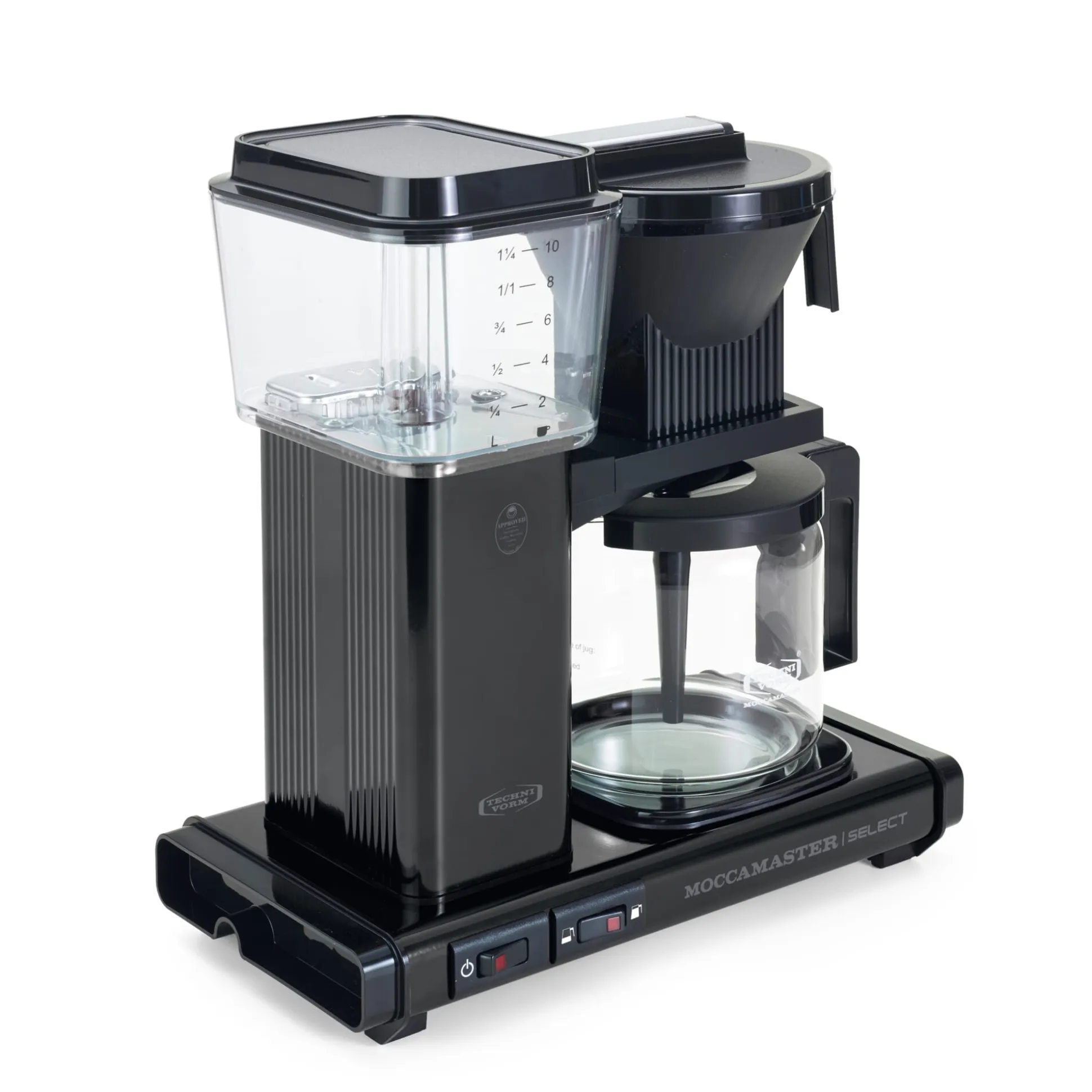 Mit automatischer Abschaltfunktion nach 40 Minuten. Gehäuse Aluminium. Glaskanne mit 1,25 l Volumen (10 Tassen). Wasserbehälter aus transparentem, Kannendeckel aus schwarzem Kunststoff. Filterhalter Größe 4. Leistungsaufnahme 1.350–1.520 W.