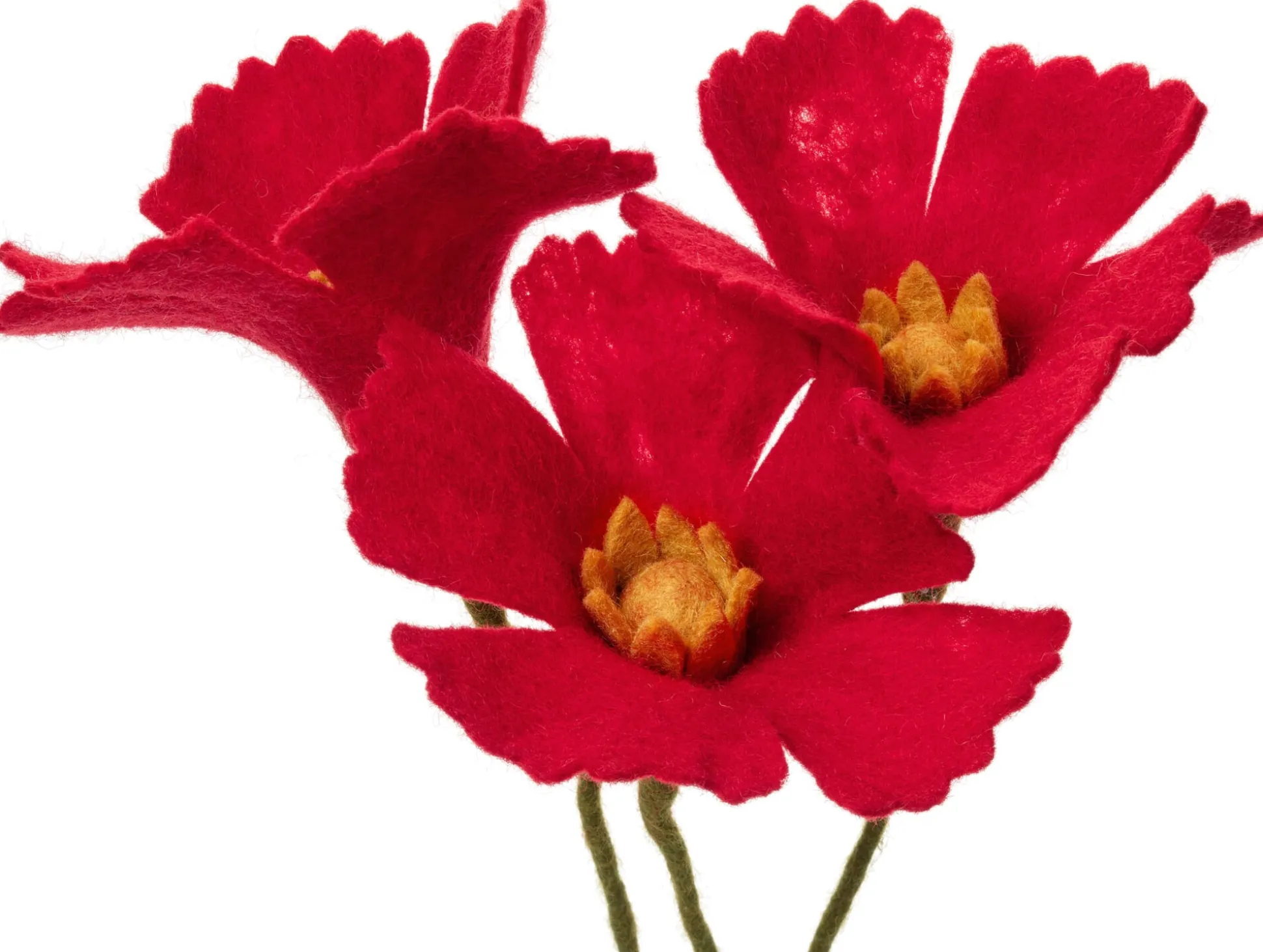 Türkischer Mohn, Klatschmohn, Arzneimohn oder Schlafmohn – welche rot blühende Art der Gattung Mohn (Papaver) Sie auch betrachten, ihr intensiver Farbton ist immer ein faszinierender Hingucker. Es ist geradezu ein Jammer, dass der heimische Klatschmohn je Pflanze nur zwei bis drei Tage lang blüht. Und wer Kinder oder Haustiere hat, sollte ohnehin besser auf echten Mohn verzichten, denn alle Teile der Pflanze sind giftig (auch wenn sie nicht zum Opiumrausch führen, dafür braucht es zum einen Schlafmohn, zum anderen die spezifische Verarbeitung des Saftes der unreifen Samenkapseln). Ungefährlich für Groß, Klein und Fellnasen sind dagegen unsere handgefilzten Mohnblumen aus reiner neuseeländischer Schurwolle. Sie ahmen die Mohnblüte dekorativ nach, blühen wunderbar ausdauernd und bescheren Ihrer Raumdekoration über viele Tage, Monate und Saisons hinweg einen leuchtenden Farbakzent, in der Vase ebenso wie als Serviettenring oder auf dem Präsent.