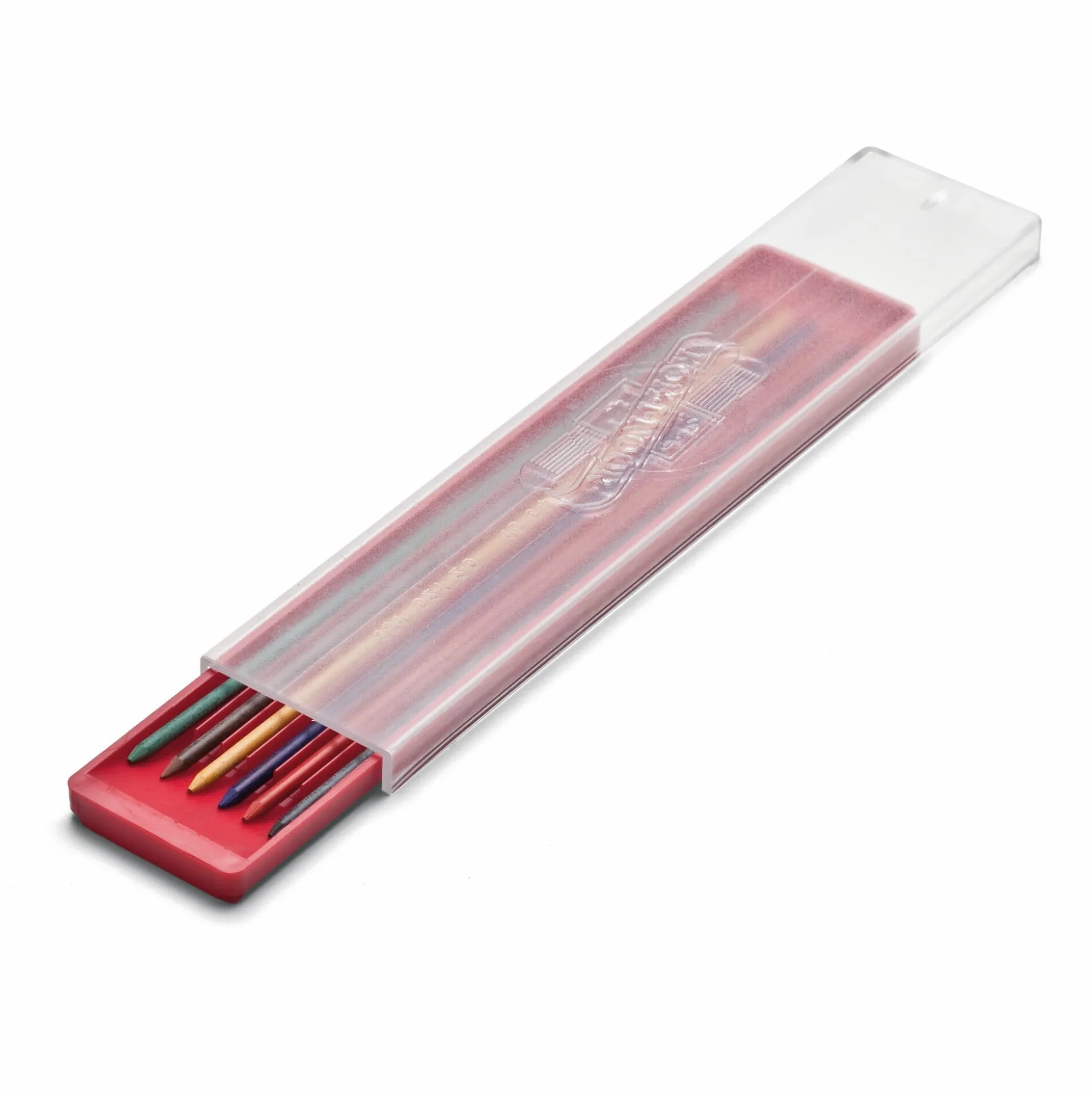 Nachfüllminen für Druckbleistifte wie die Koh-i-Noor Minenhalter. Schachtel mit 6 Farben: Gelb, Schwarz, Grün, Blau, Rot und Braun. Hergestellt in Tschechien. Ø 2 mm.