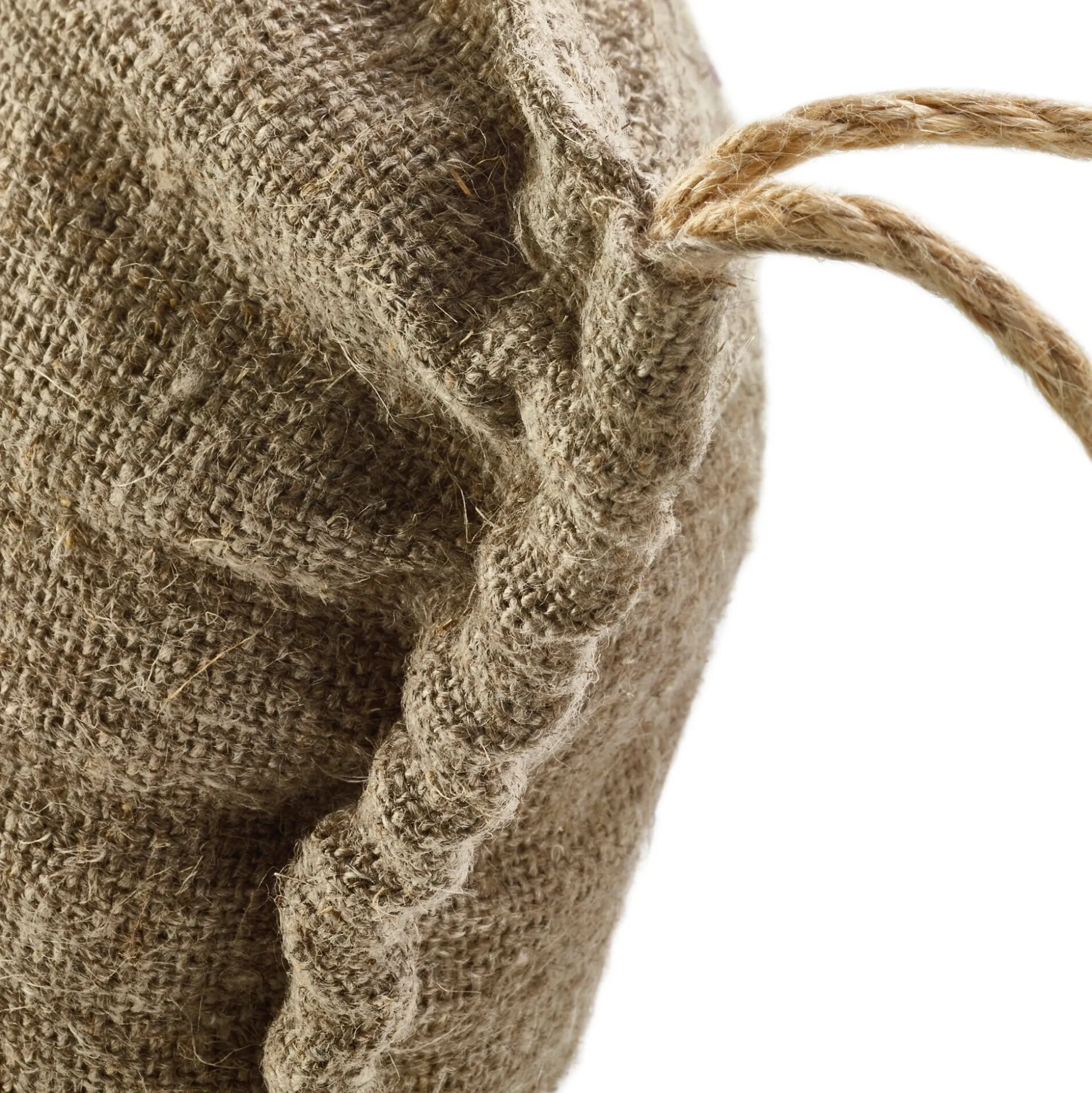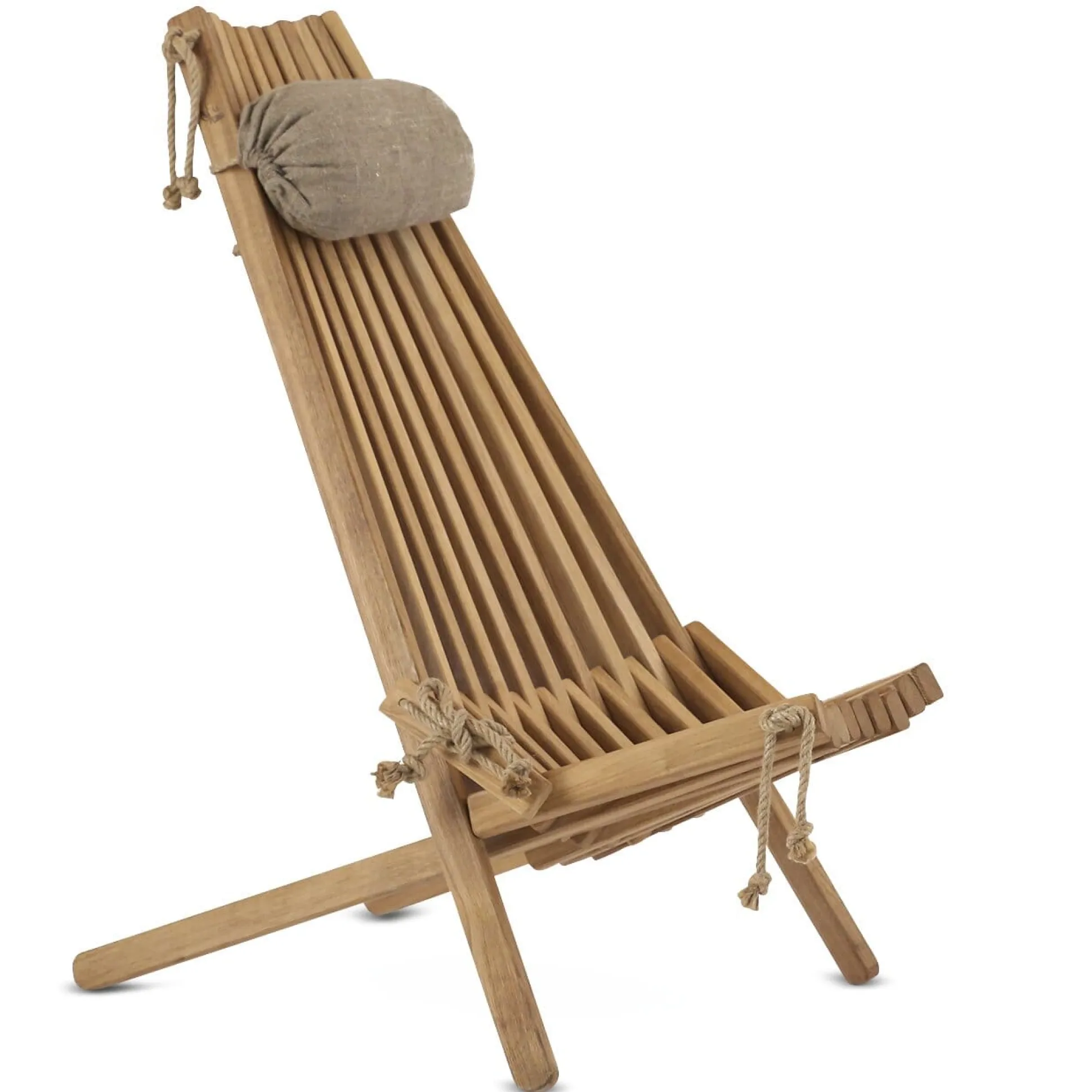 Ein einfaches Kopfkissen aus grobem Leinengewebe, das den Liegekomfort auf dem Faltsessel aus Lärchenholz erhöht. Die Kordeln dienen der Befestigung am Kopfteil.
