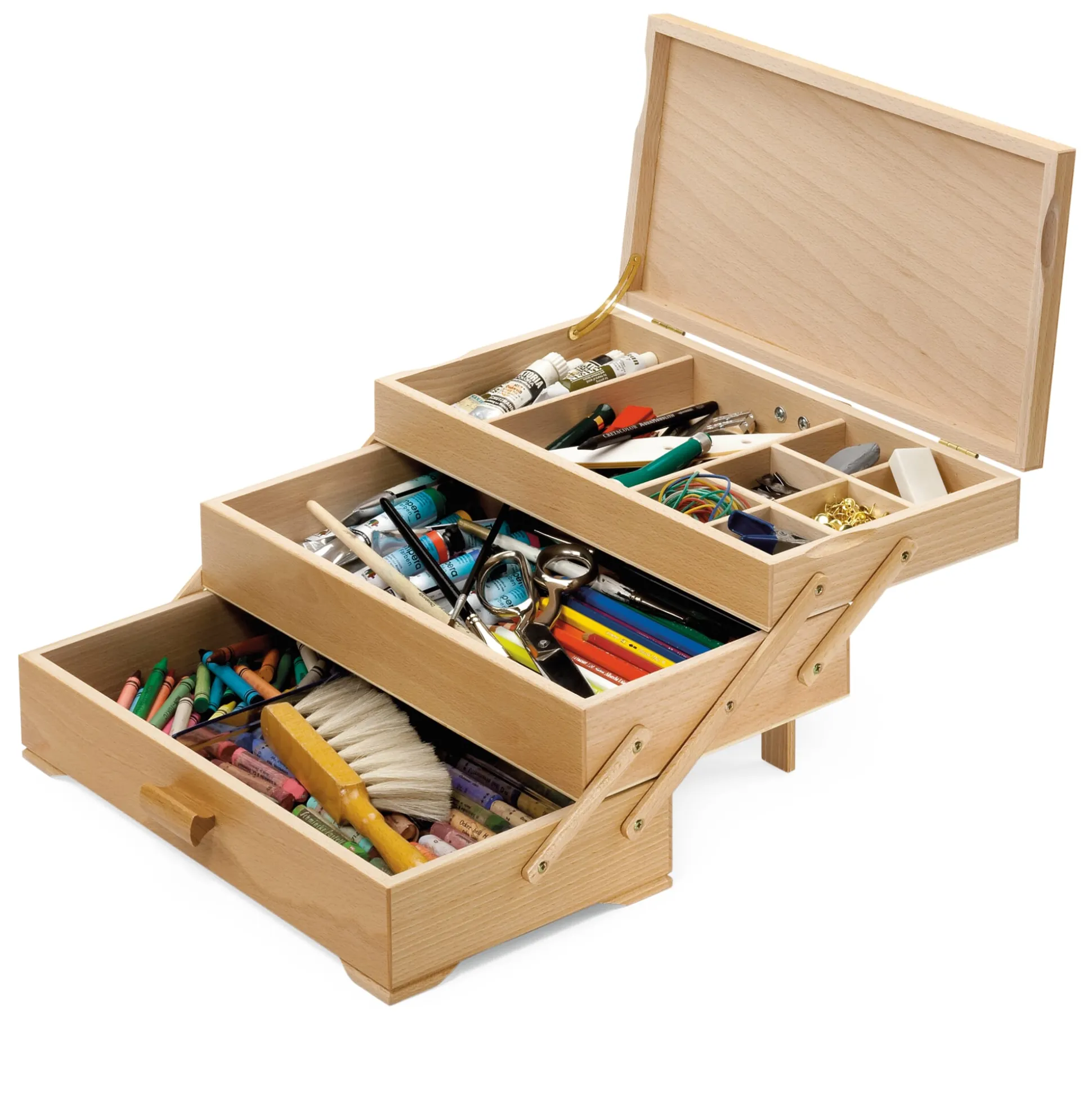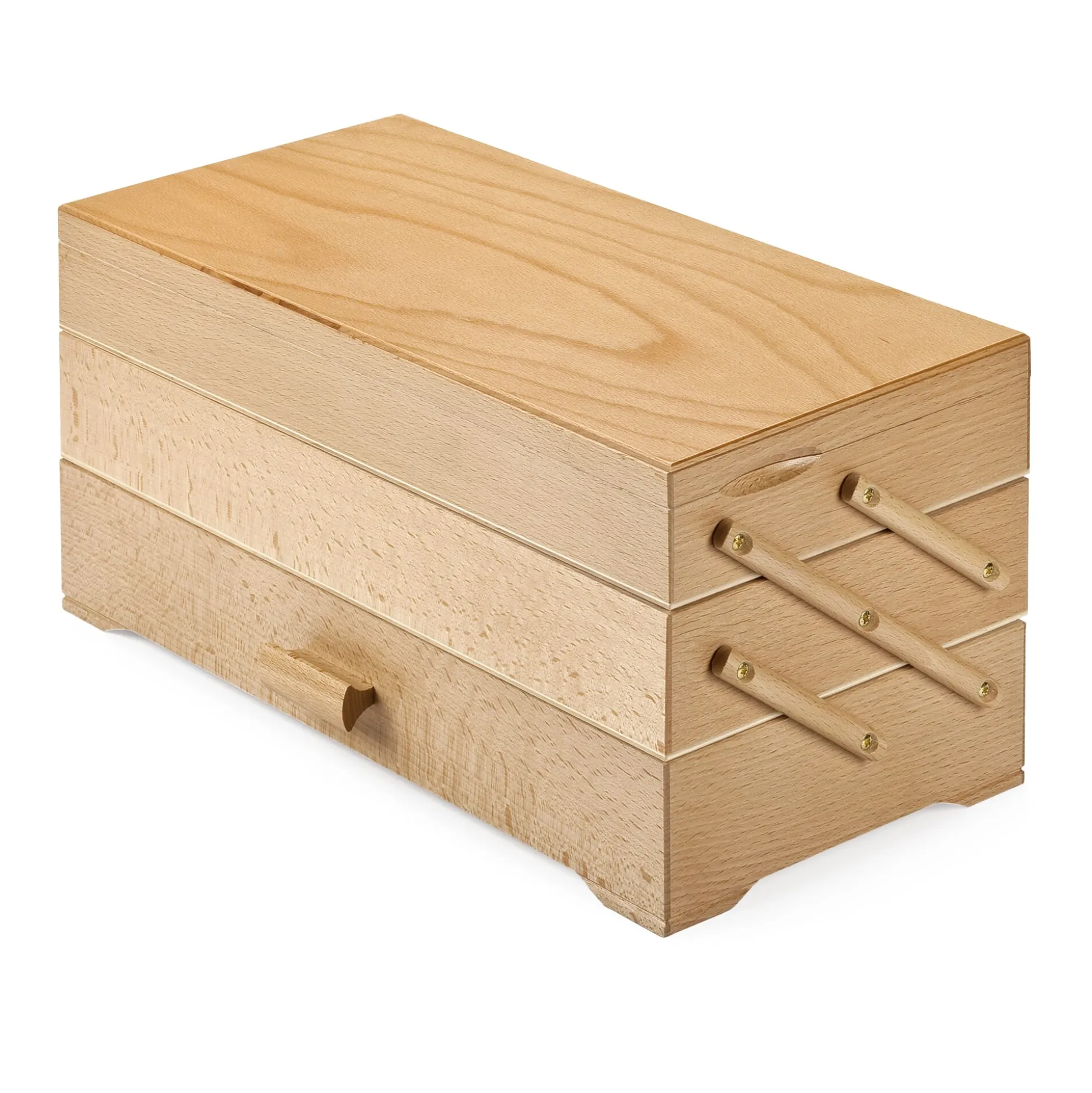 Buchenholz, außen lackiert. Obere Lade mit sechs kleinen und zwei größeren Fächern. Ein Stützfuß verhindert in aufgeklapptem Zustand das Kippen. Höhe 17 cm, Breite 35,5 cm, Tiefe 18 cm. Gewicht 1,6 kg. Lieferung ohne Dekoration.