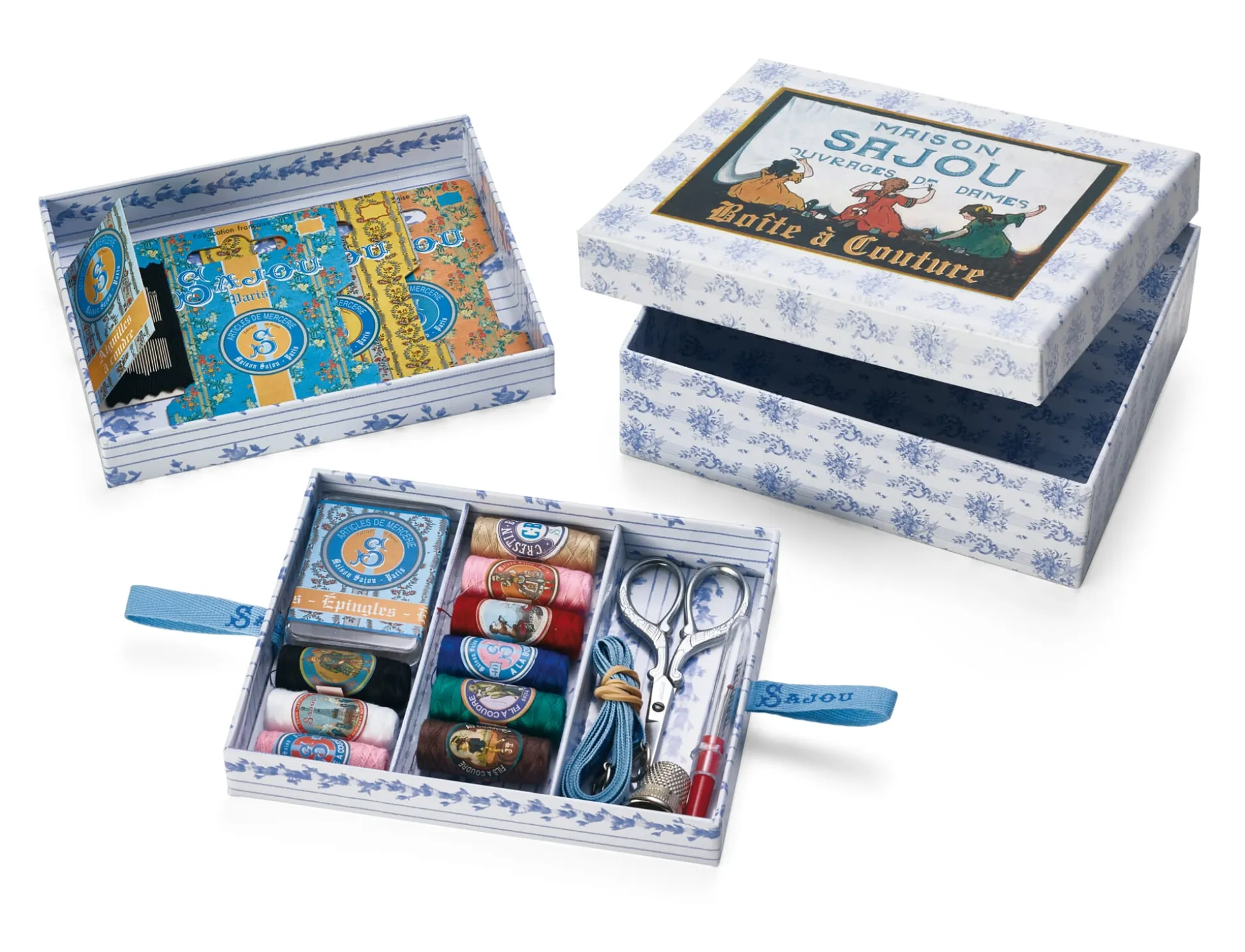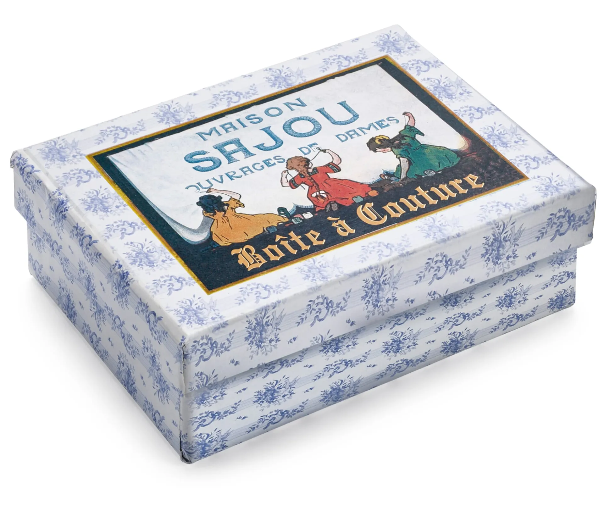 Die Nähschatulle von Sajou, gefertigt aus kaschiertem Karton und bedruckt mit hübschen Motiven aus der Zeit um 1900. Eine Schatulle mit zwei Fächern, die wir befüllt mit den wichtigsten Nähutensilien anbieten.