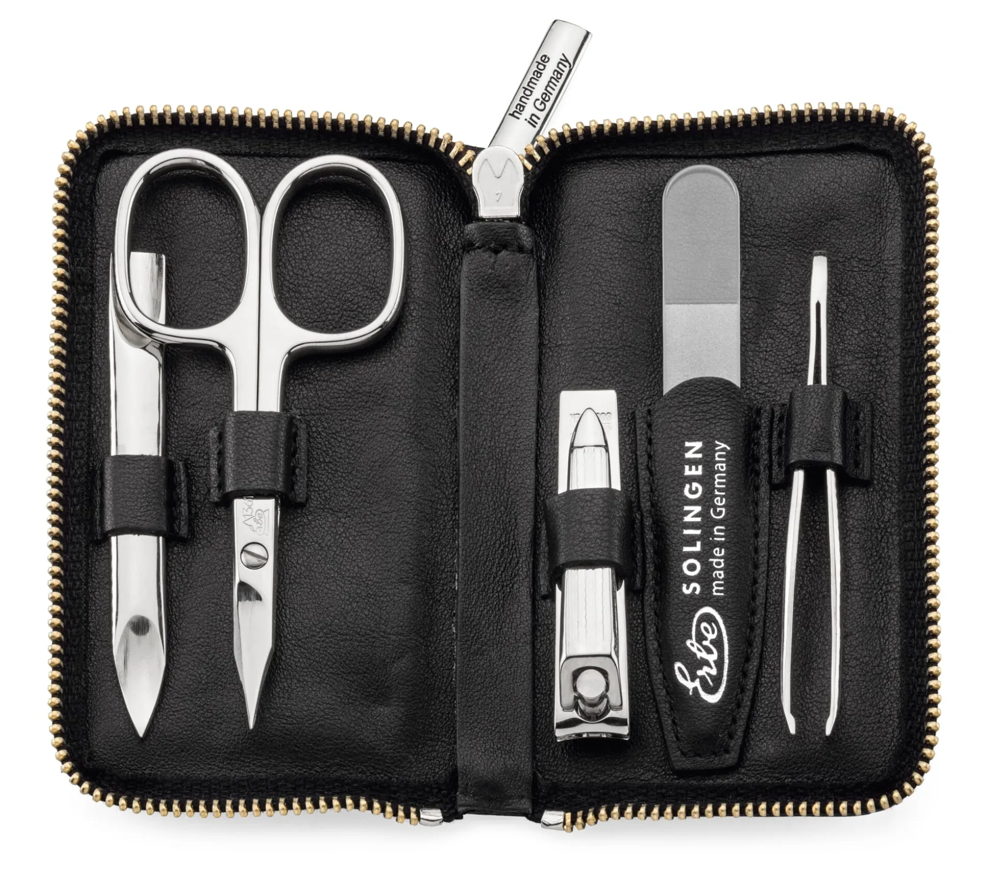 Komplett in Solingen gefertigt und mit fünf Werkzeugen ausgestattet: Schere, Nagelknipser, Glasfeile, Pinzette und Heftinstrument mit beidseitig benutzbaren Enden. Das alles in Etui mit breitem Reißverschluss und aus weichem Rindleder gefertigt.