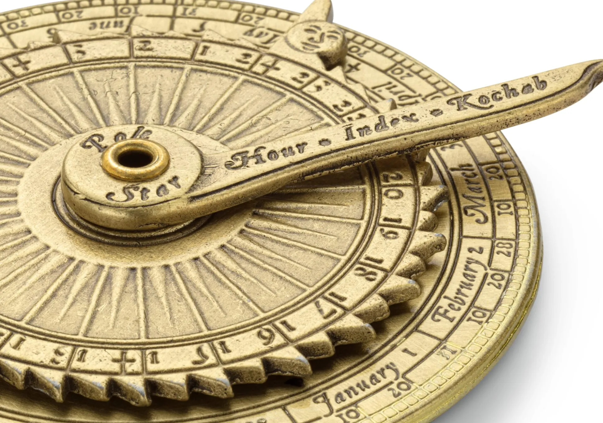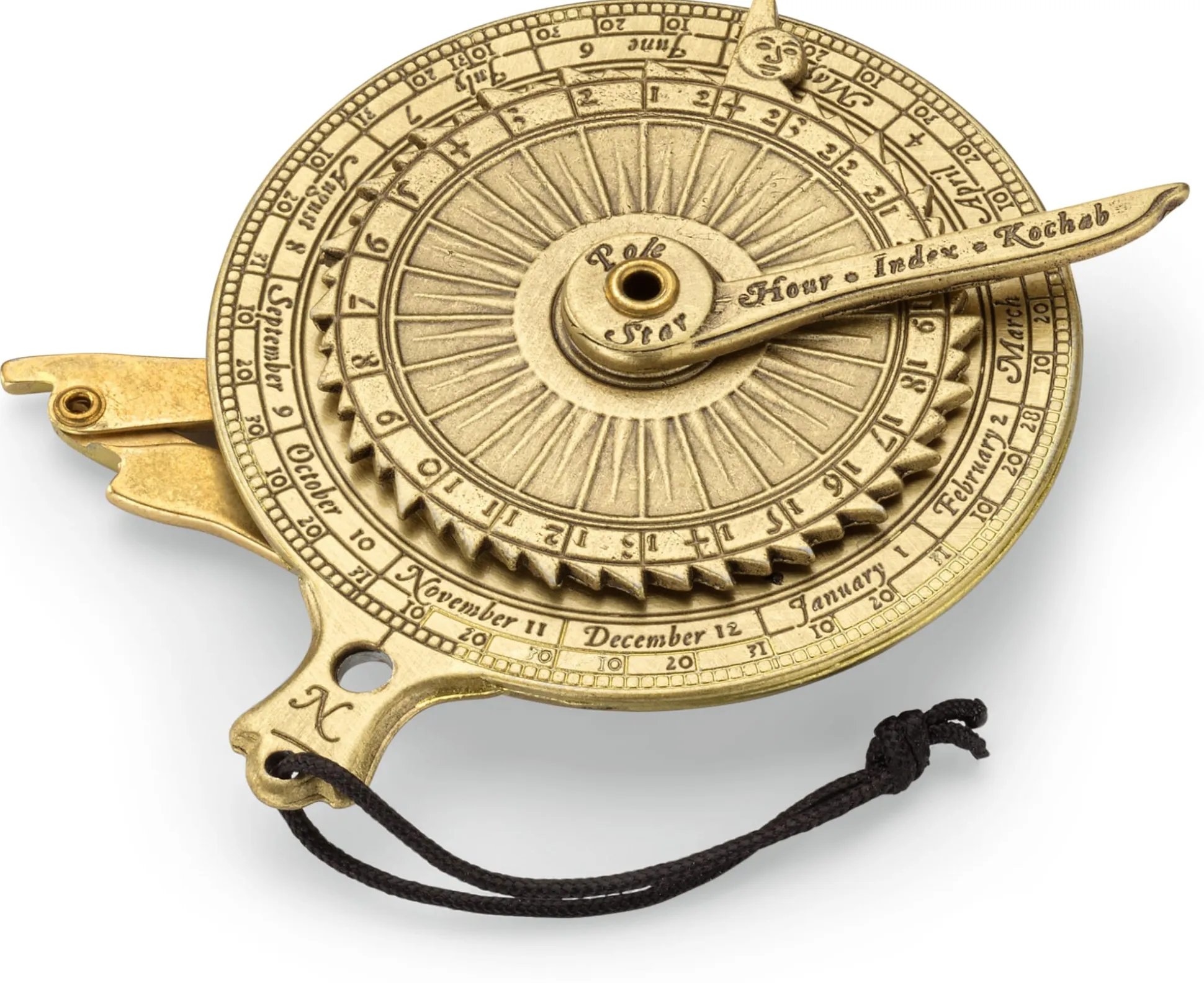 Übrigens ist das genaue Datum der Erfindung einer auch Nocturlabium genannten Sternenuhr nicht bekannt, die älteste bekannte schriftliche Erwähnung eines solchen Gerätes stammt von 1295. Unsere Nocturnal Sternenuhr folgt einem historischen Vorbild von 1570; es ist im British Museum in London zu finden.