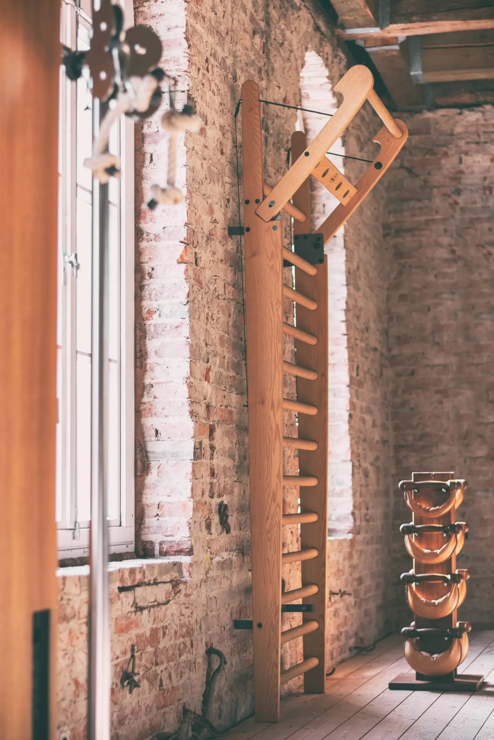 Trainingsgeräte für zu Hause sollen zum einen platzsparend und praktisch, andererseits natürlich auch ansehnlich sein, allerdings erfüllen die klassischen Heimtrainer wie Fahrrad-Ergometer, Laufband oder Trainingsbank diese Kriterien oft nur partiell. Bei unserer Suche nach einem Gerät, das tatsächlich allem Genüge tut, sind wir schließlich auf die gute alte Sprossenwand zurückgekommen, allerdings auf eine, die ein paar mehr als sinnvolle Modifikationen erfahren hat. So lässt sich der Ausleger, an dem Sie auch Klimmzüge trainieren oder mit Gummizugbändern arbeiten können, nach dem Training einfach hochklappen. Mit dem Stangenmodul und der Schrägbank wird die Sprossenwand zu einer veritablen, multifunktionalen Trainingsstation. Im Gegensatz zu den handelsüblichen wird sie zudem aus hartem, belastbarem Eichenholz gefertigt und ist dadurch fast schon ein Möbelstück.
