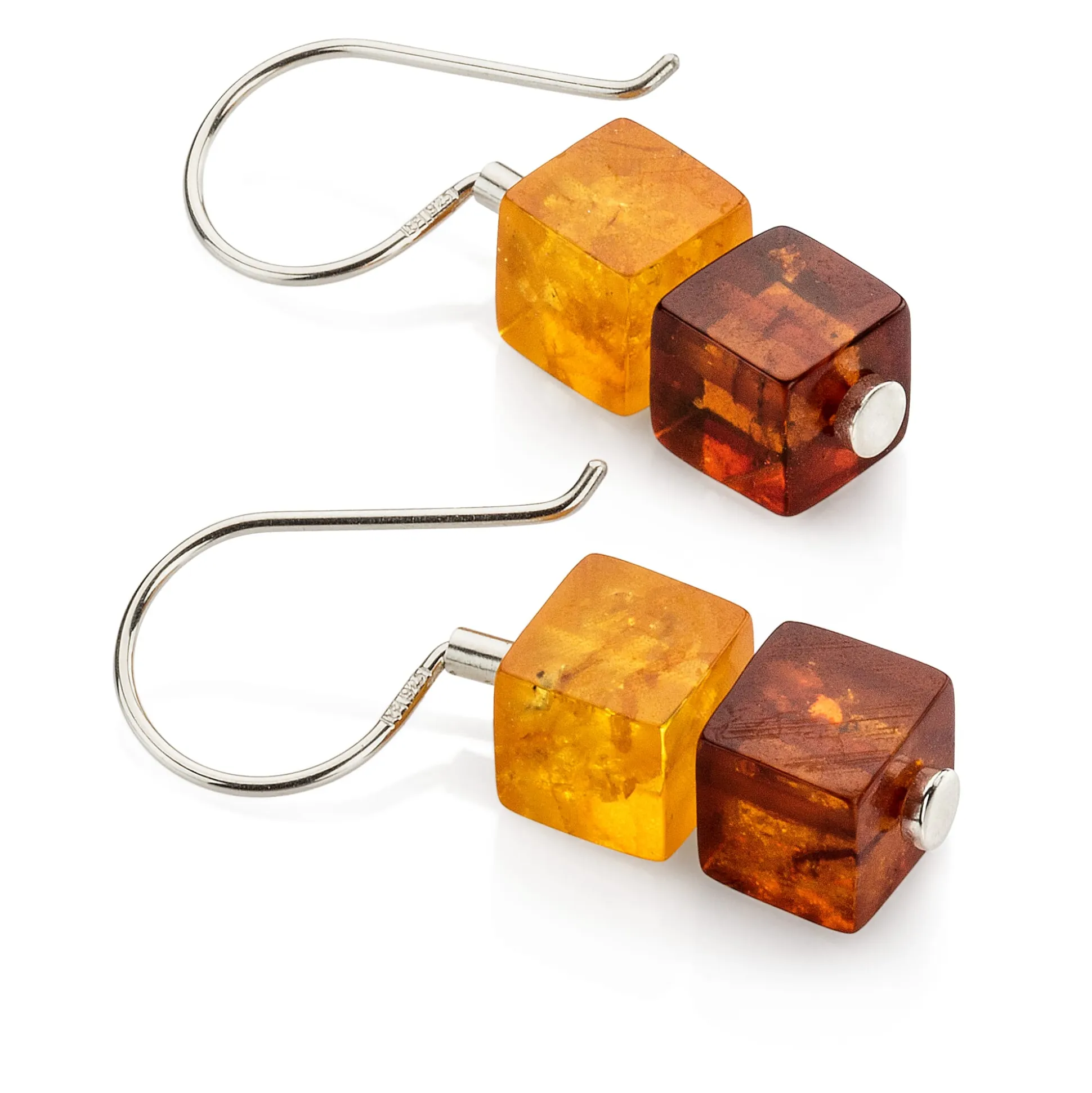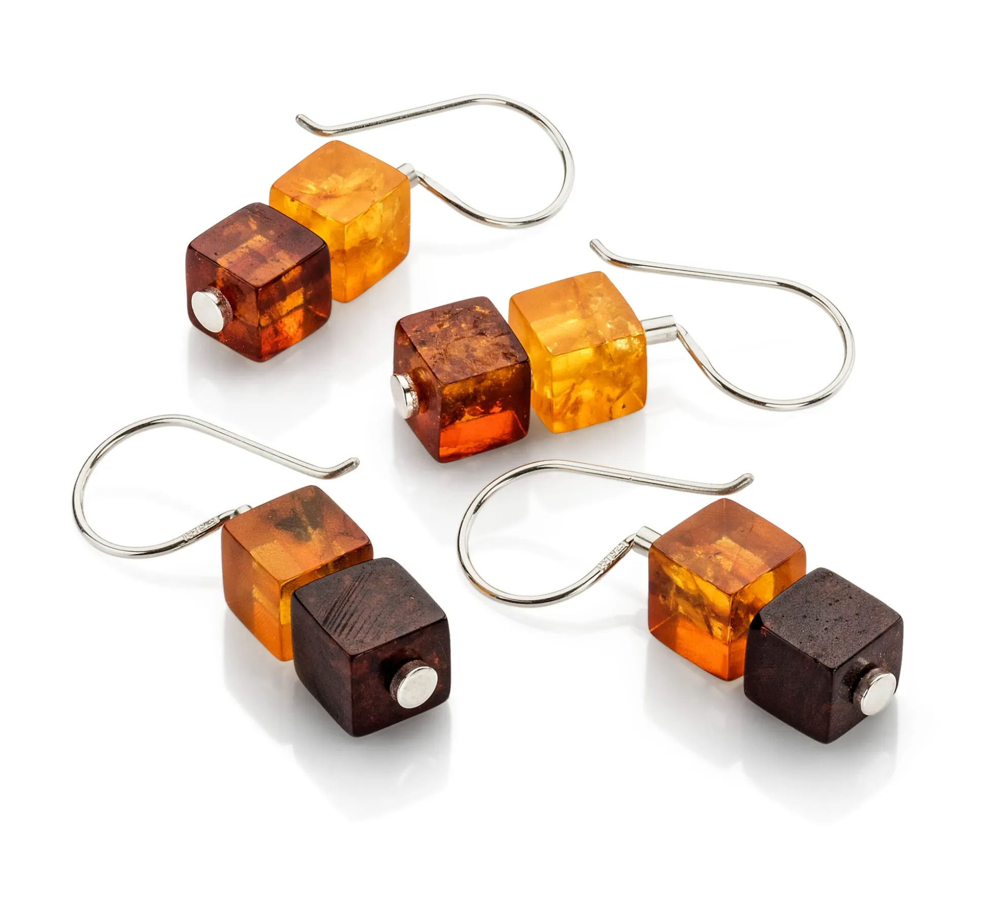 Behandelter Bernstein, poliert, in unterschiedlichen Farbtönen. Hänger aus 925er Silber. Länge 3 cm. Kantenlänge der Würfel 7 mm. Gewicht pro Stück 1 g. 1 Paar.