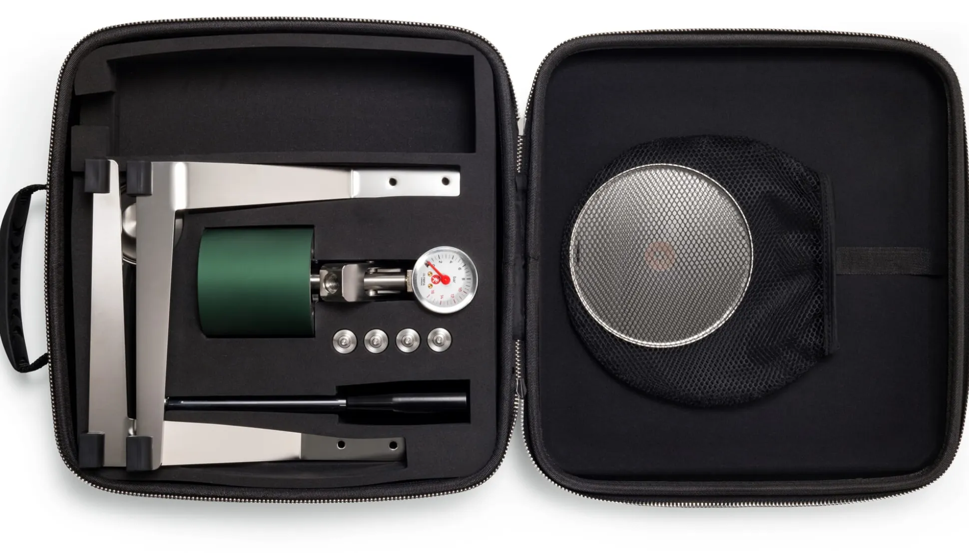 Aluminumkorpous in einem Gestell aus Edelstahl. Gummifüße. Griffe von Handhebel und Siebträger aus Hartkunststoff. Höhe 31 cm (mit aufgestelltem Hebel 43 cm), Breite 17 cm, Tiefe 19 cm. Gewicht 2,5 kg. Lieferung mit Transportkoffer (31 × 30 × 10 cm, Gewicht 870 g). Folgendes Zubehör ist im Lieferumfang enthalten: 1 Siebträger (Eintassenportion), 1 Tamper aus Edelstahl (Ø 49,5 mm, H 3,5 cm), 1 Tropfschale aus Edelstahl (Ø 12 cm).