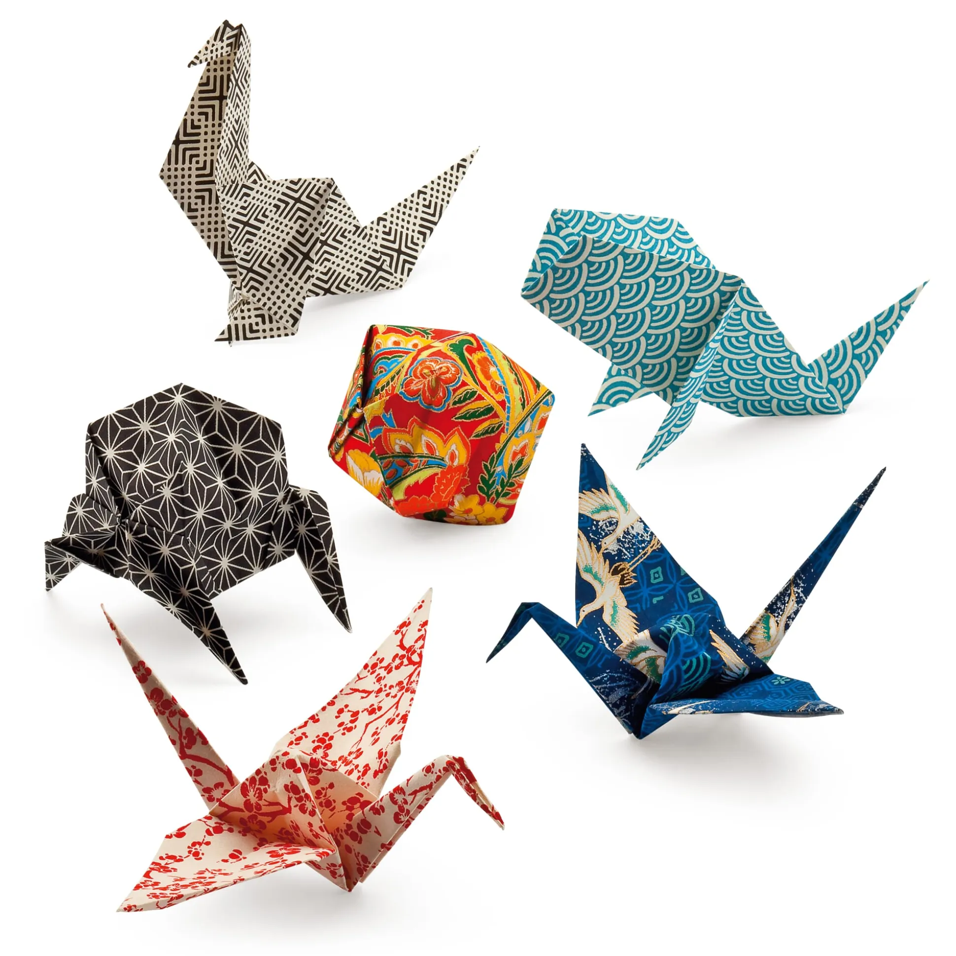 Vor mehr als 2.000 Jahren wurde in China das Papier erfunden. Von dort brachten es Mönche im 7. Jahrhundert nach Japan. Ob sie dabei auch die Kunst des Papierfaltens mitbrachten, ist unklar, unstrittig ist dagegen, dass die Japaner die einzigen sind, die das Papierfalten zu einer ausgeklügelten Kunstform verfeinerten – dem Origami (vom japanischen oru = falten und kami = Papier). Ausgangspunkt ist dabei stets ein quadratisches Blatt Papier, das ohne Hilfsmittel zu zwei- oder dreidimensionalen Objekten gefaltet wird. (Wird es wieder entfaltet, darf es weder Klebestellen noch Schnitte aufweisen.) Dabei gibt es eine Reihe unterschiedlicher Falttechniken wie die Berg- und Talfalte, die Quetschfalte, die Zick-Zack-Faltung oder die Blütenblatt-Faltung. Bei den Formen und Objekten, die man dabei nachbildet, sind der Phantasie kaum Grenzen gesetzt. Es beginnt mit den klassischen, seit Jahrhunderten überlieferten Grundformen – Wasserbombe, Vogel, Frosch und Windmühle –, die ihren Vorbildern nicht bis ins Detail ähnlich sehen, dafür aber mit 10 bis 30 Faltschritten auskommen, und endet bei komplexen, detailgenauen Objekten, die ihr Vorbild so lebensnah wie möglich abbilden und dazu bis zu 300 Faltmanöver benötigen. Mittlerweile hat man auch hierzulande die gleichzeitig konzentrationsfördernde und entspannende Wirkung des Origami erkannt. Vor allem, weil es einfach Spaß macht, beim Falten der Objekte nicht nur spielerisch die kreativen, künstlerischen Fähigkeiten zu fördern, sondern auch das mathematische Verständnis und das räumliche Vorstellungsvermögen zu schulen. Für den Selbstversuch bieten wir Ihnen zwei unterschiedliche Papiere mit klassischen Mustern an, die selbstverständlich aus Japan kommen.