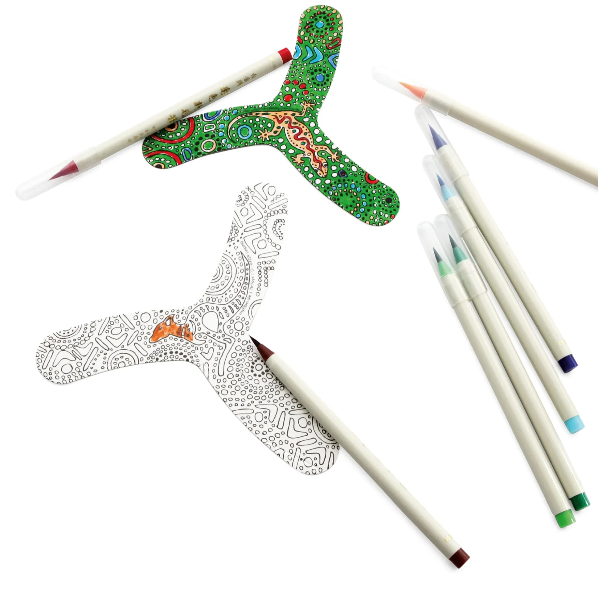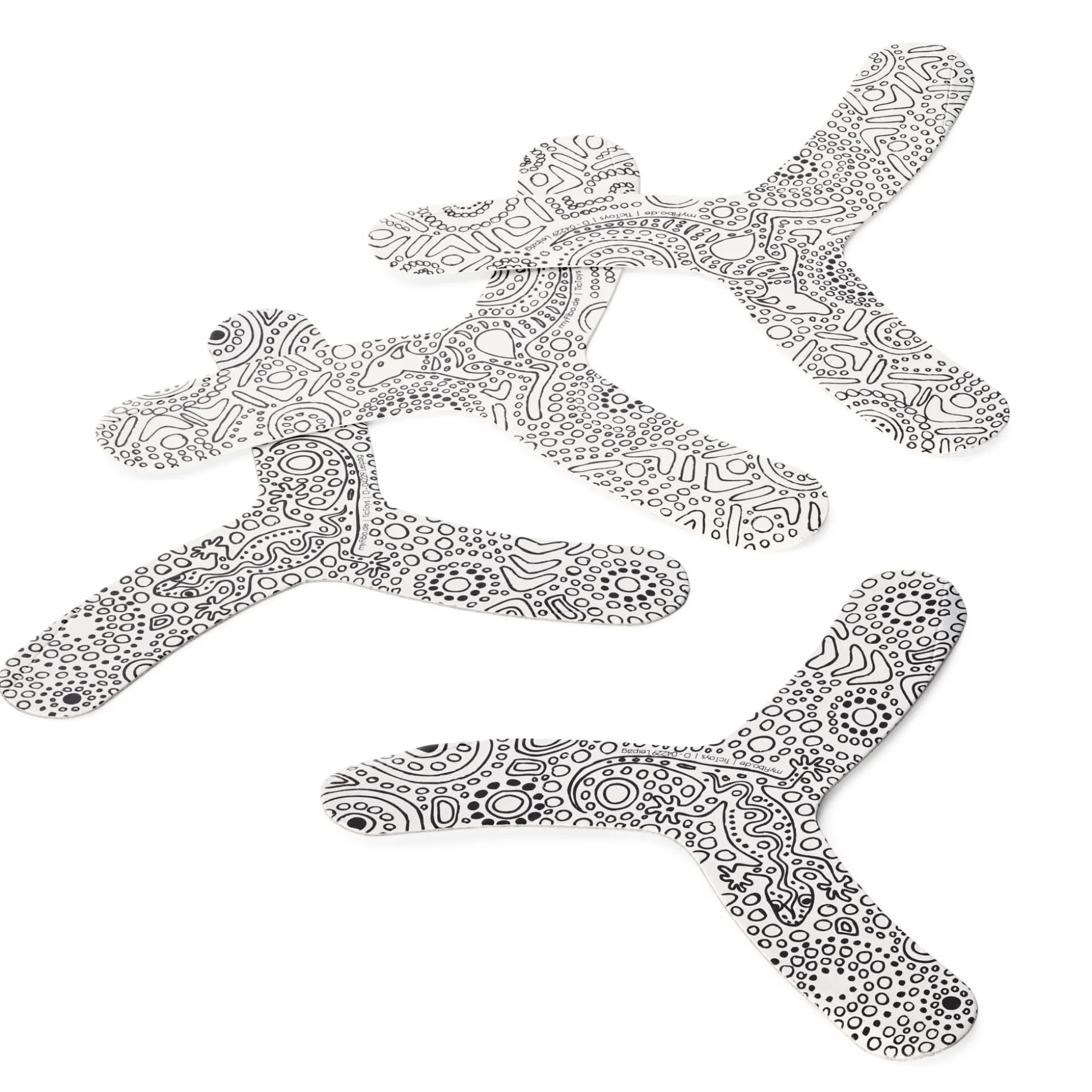 Ab 4 Jahre. 4 Bumerangs aus Pappe, dreiflügelig. 2 Bumerangs für Einsteiger, Ø 18 cm, mit Känguru-Aufdruck, Flugkreis 2–3 m. 2 Bumerangs für Fortgeschrittene, Ø 15 cm, mit Gecko-Aufdruck, Flugkreis 4–5 m. Mit einer ausführlichen Anleitung.