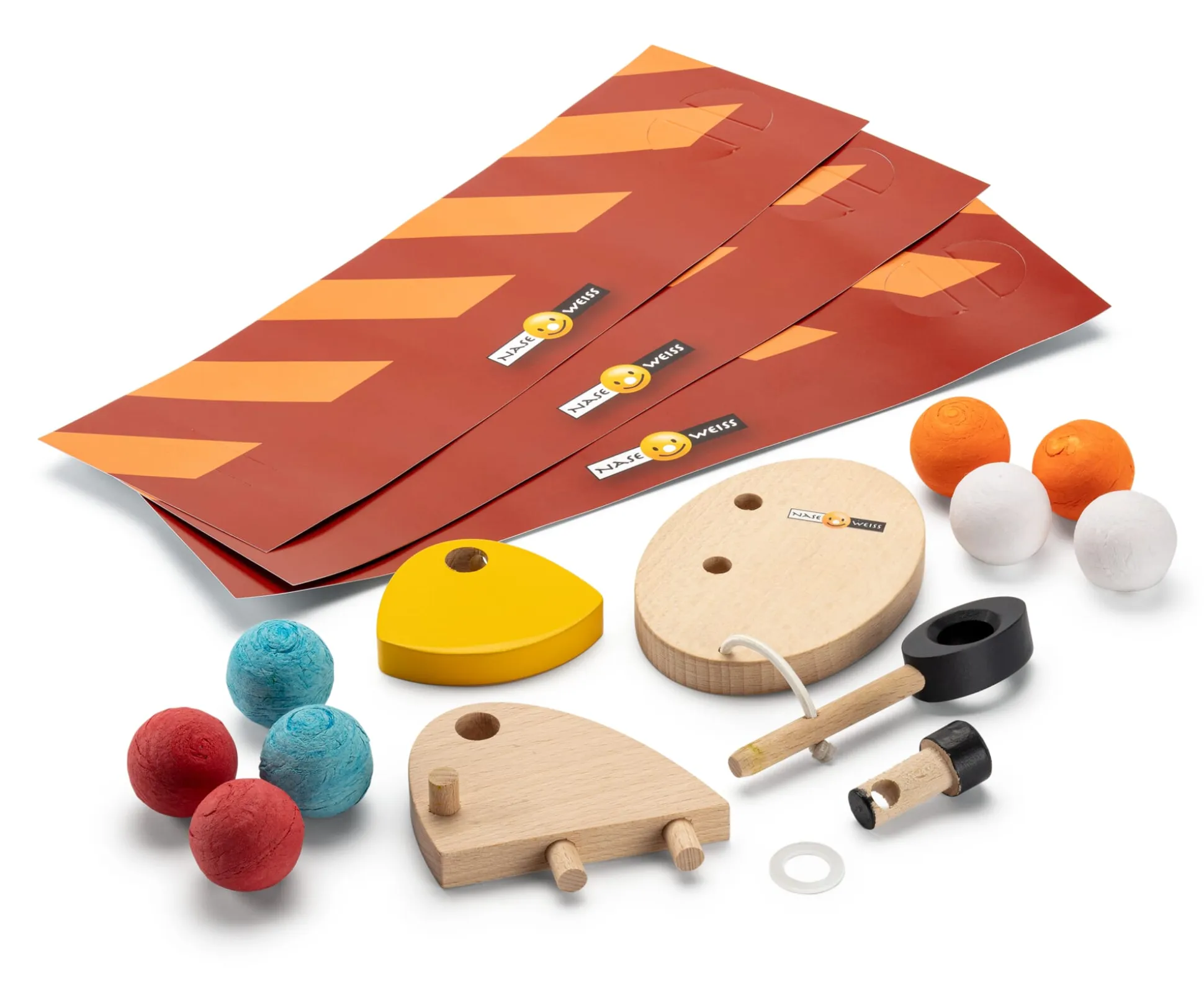 Den Wurfarm spannen, halten, zielen – und loslassen! Auf den ersten Blick mag das Katapult unscheinbar wirken, doch es wird aus massivem Buchenholz-Bauteilen und einem starken Spanngummi zusammengesetzt. Die kinetische Energie, die es schließlich erzeugt, entpuppt sich als recht eindrucksvoll: Ein bis zwei Meter weit schleudert das Katapult die leichte Papierkugel Richtung Ziel – trifft sie? Fliegt sie vorbei? Wie sich zeigt, braucht es doch ein wenig Übung, Spann- und Schnellkraft sowie die Flugbahn einzuschätzen und die Kugel auf einen zielgenauen Flug zu schicken. Sechs große, bunte Papierkugeln und ein Zielring liegen dem Bausatz bei. Mit etwas Spucke und Geduld können natürlich auch eigene Papierkugeln als Reservemunition gebastelt werden – sie müssen nur groß genug sein, um nicht durch den Wurfring zu rutschen.