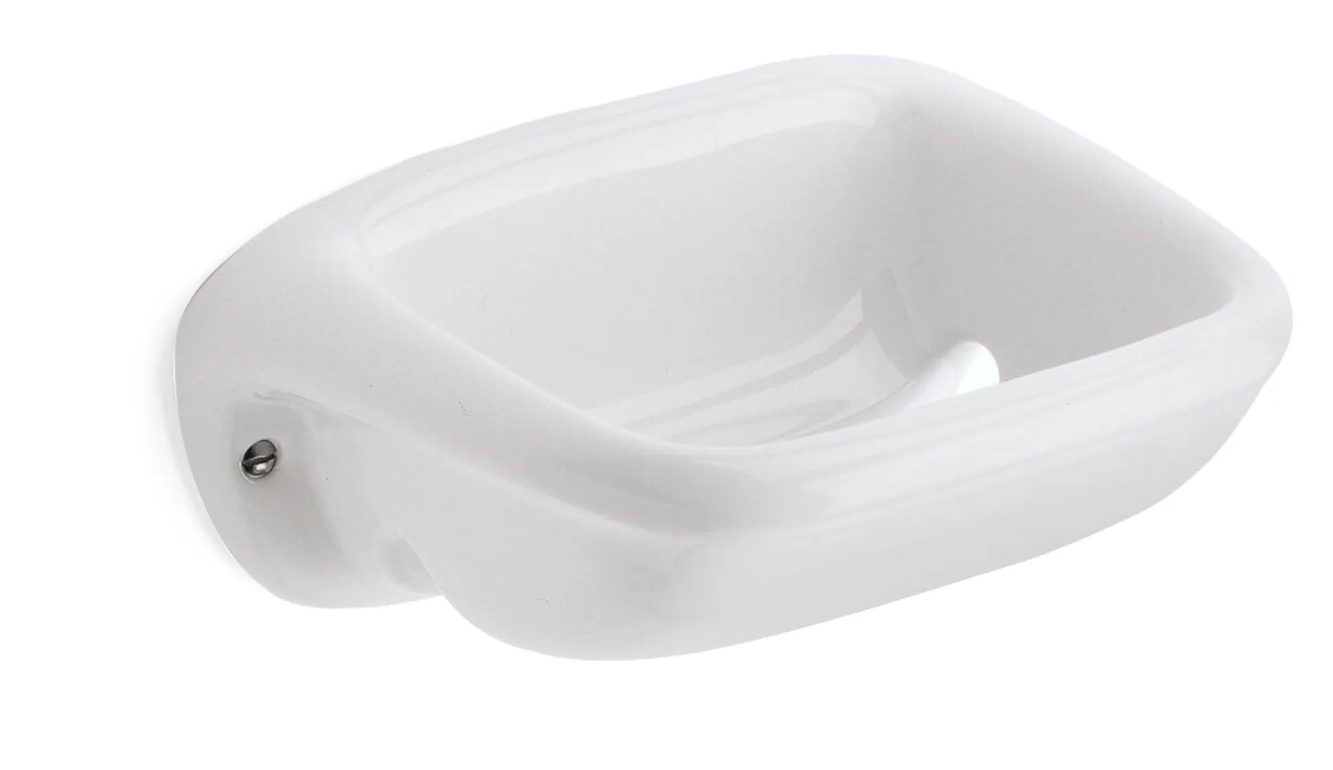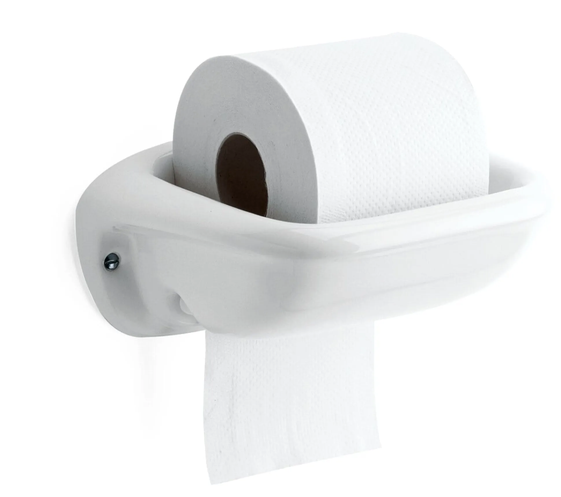 Bei diesem Papierrollenhalter wird eine Rolle Toilettenpapier in die Mulde gelegt und das Papier durch den Schlitz nach unten gezogen. Hergestellt wird der Porzellanhalter von der Porzellanfabrik Lindner im oberfränkischen Küps.