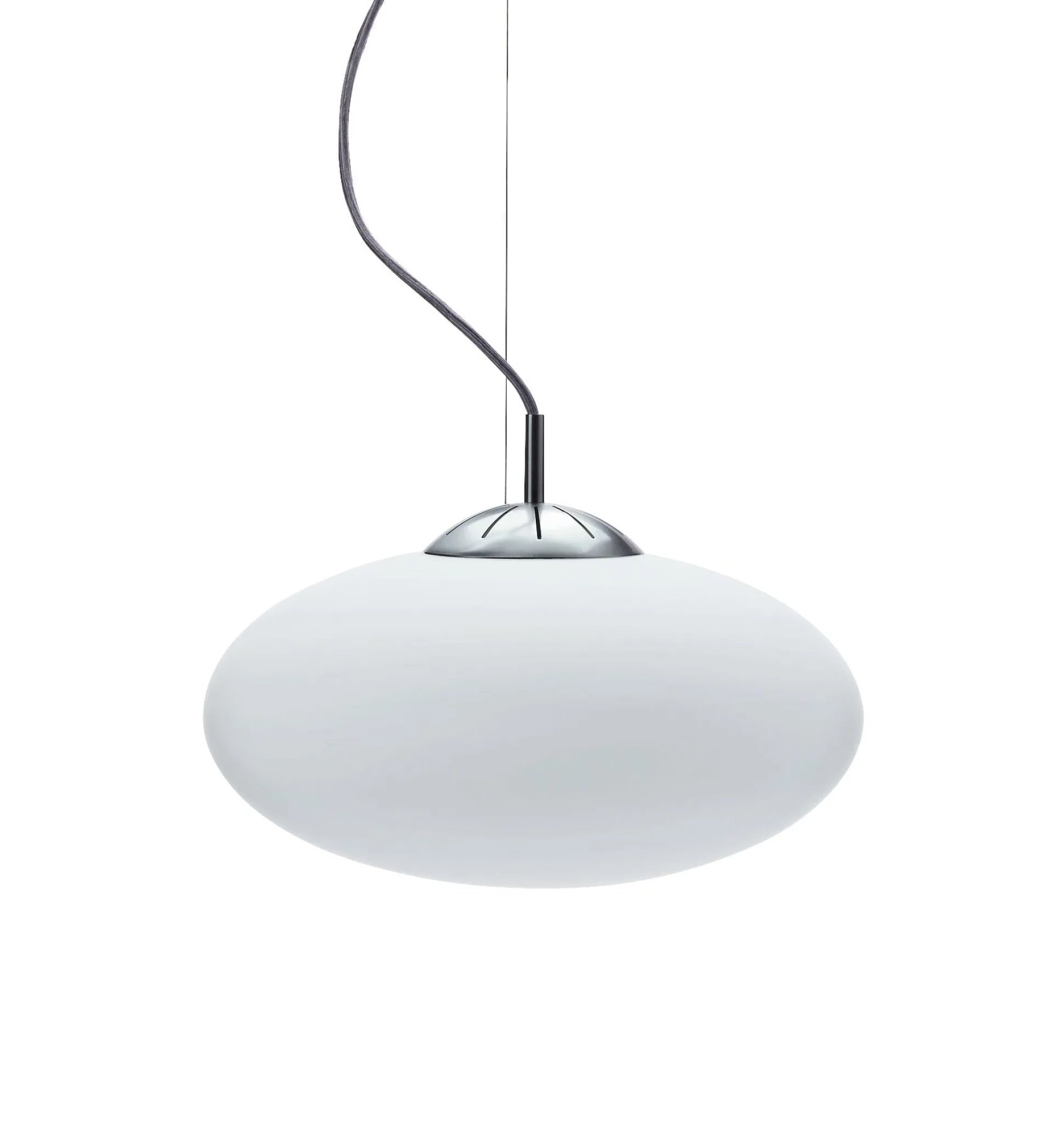Glaskörper Triplex-Opalglas, Glashalter, Rosette und Baldachin matt vernickelt. Textilkabel, Länge 2 m. Fassung E 27 (max. 100 W). Hergestellt in Tschechien.