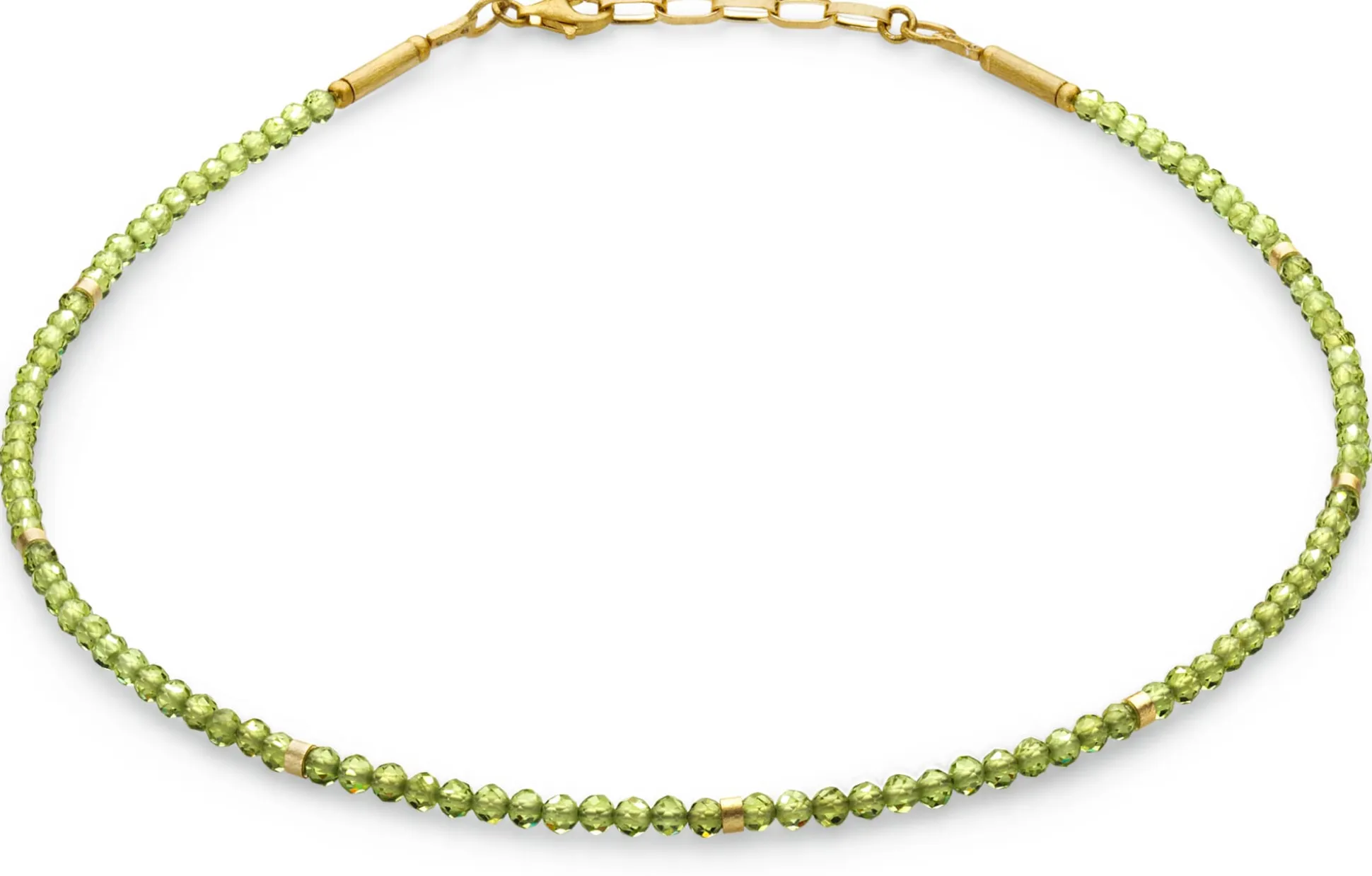 Peridotperlen, Ø 3,6 mm und Zierringe, 925er Silber vergoldet, aufgezogen auf Stahlseil. Schließe 925er Silber vergoldet. Länge 40–43 cm. Gewicht 10 g.