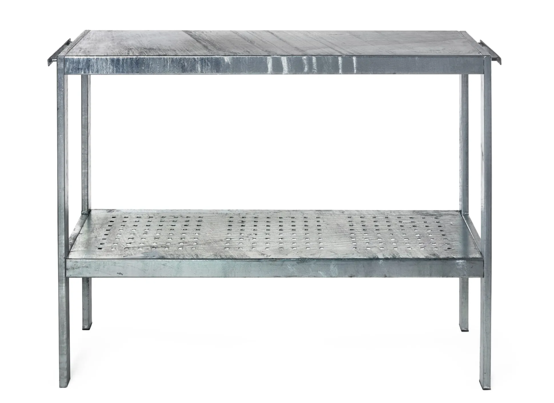 Der Tisch verfügt über einen gelochten (z.B. für Gärtnerarbeiten) und einen durchgehenden (u.a. als Ablagefläche) Boden (106 x 40 cm). Welchen Boden man als obere Ebene einsetzt, kann beliebig entschieden werden. Zudem wird an die beiden oberen Querstreben des Rahmens jeweils eine Utensilienleiste montiert.