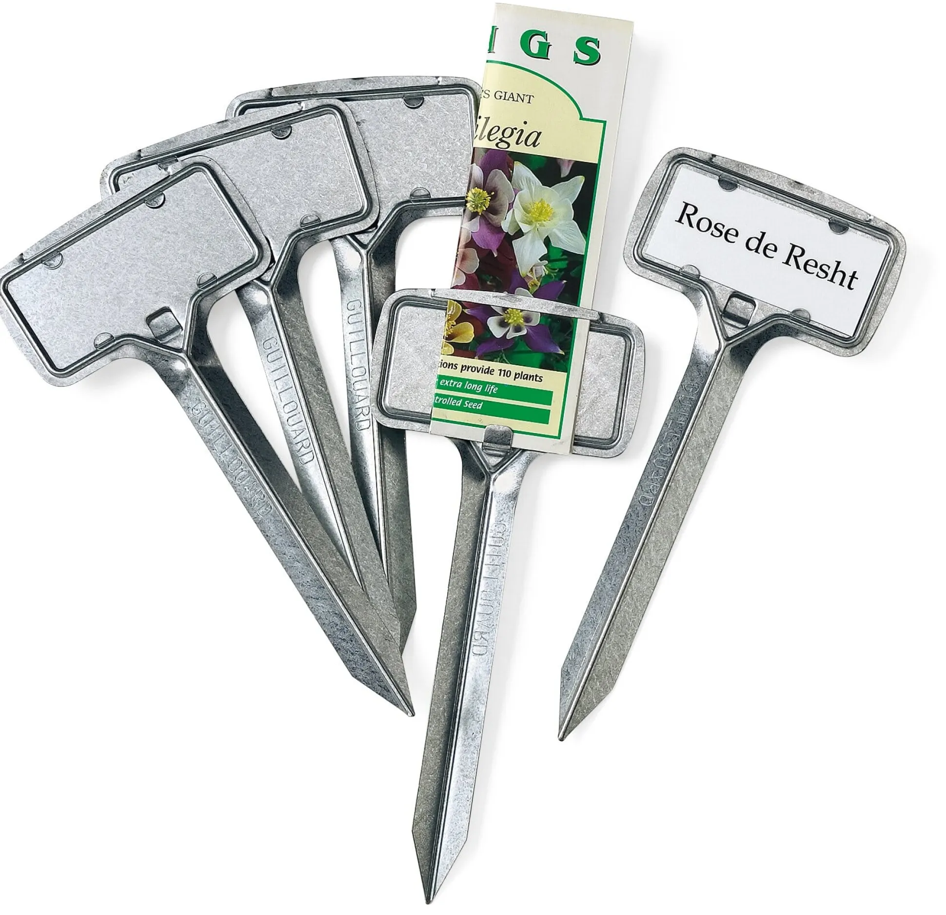 Zur Kennzeichnung von Einzelpflanzen (die Schilder werden wasserfest beschriftet oder mit wetterfest gemachten Etiketten versehen, die vorn hinter drei Laschen geklemmt werden). Aussaatreihen können markiert werden, indem die leere Samentüte durch einen Schlitz gezogen und fixiert wird.