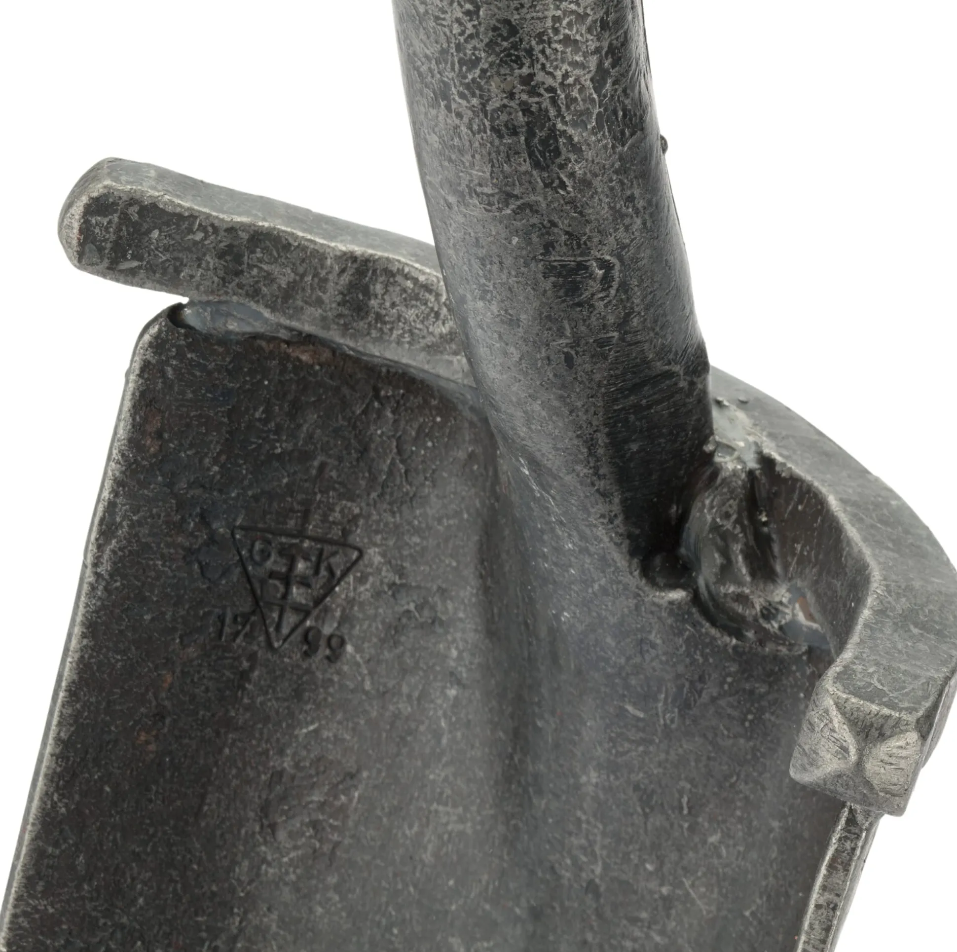 Blatt (L 24 × B 12,5 cm) aus Mangan-Bor-Stahl geschmiedet. Stiel Eschenholz (Herkunft Europa) lackiert. Mit T-Griff (B 12 cm). Gesamtlänge 111,5 cm. Gewicht 2,4 kg.