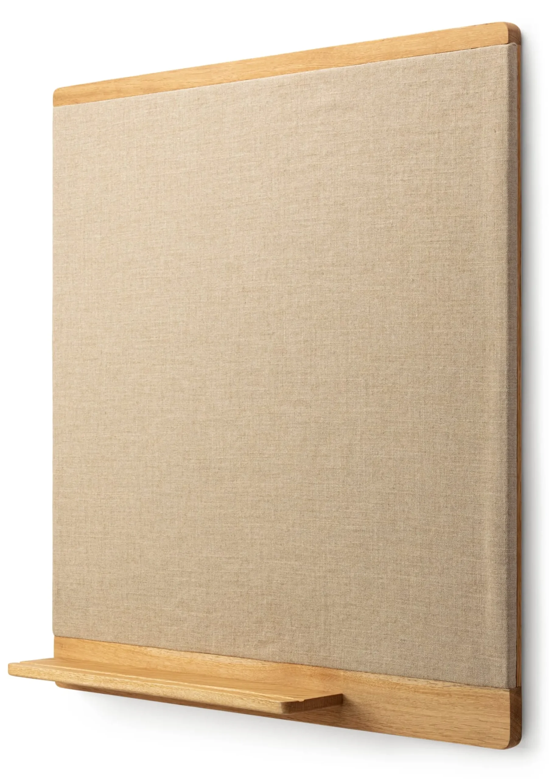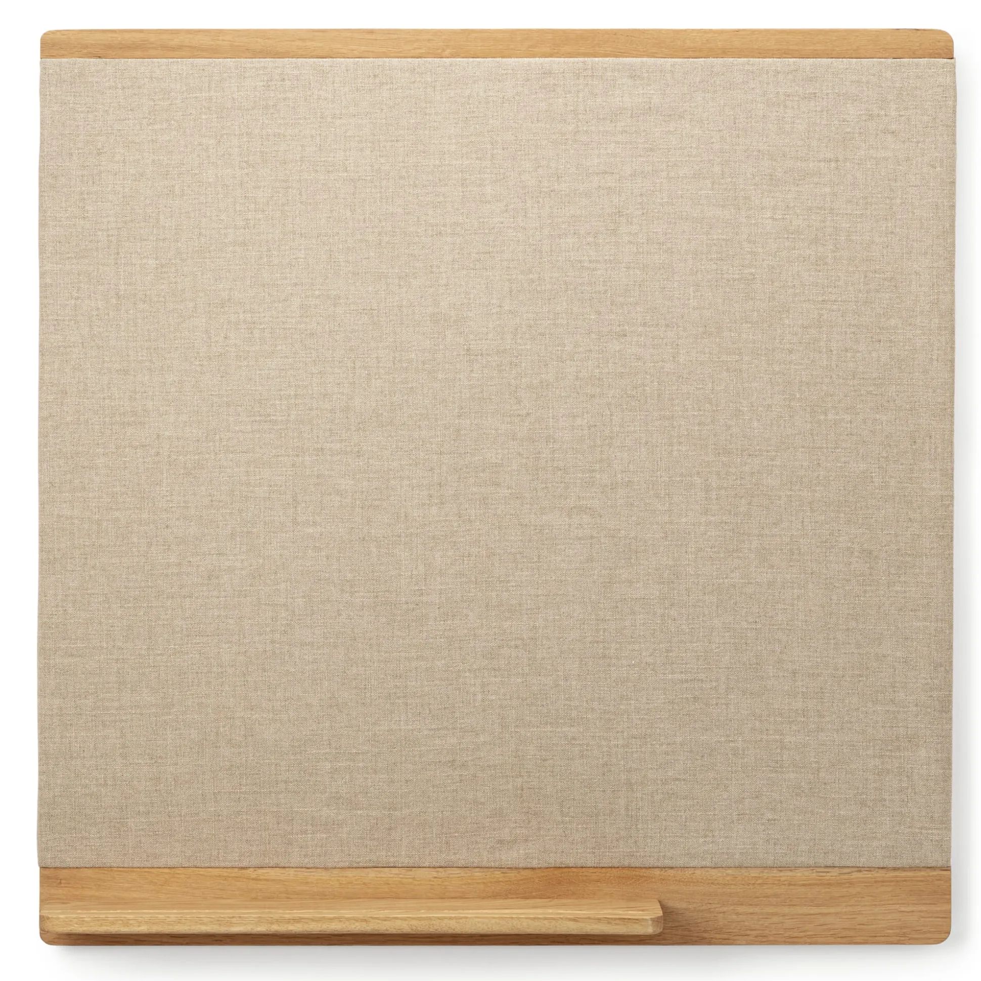 Handwerklich souverän aus massivem, geöltem Eichenholz gebaut, hält der Rahmen eine solide Holzfaserdämmplatte vor, auf die ein etwas gröberes Gewebe aus recyceltem Leinen aufgezogen ist. Heftzwecken, Pins und Stecknadeln haften bestens in dieser Kombination von Faserplatte und Leinwand, die beide materialtypisch sehr robust und langlebig sind. Mit einer Fläche von 75 × 75 Zentimetern verfügt die Pinnwand zudem über die optimale Größe, um über Schreibtisch, Flurkonsole oder Küchentisch alles Erinnerungswürdige aufzunehmen, ohne den Rahmen von Raum (und Zeit) zu sprengen. Dazu trägt auch ihre angenehm reduzierte Gestaltung bei, die in der Tradition von Shaker, Bauhaus & Co. ganz der Funktion folgt und daher die Ablage nicht vergisst, auf der unter anderem Notizzettel und Stifte deponiert werden können.