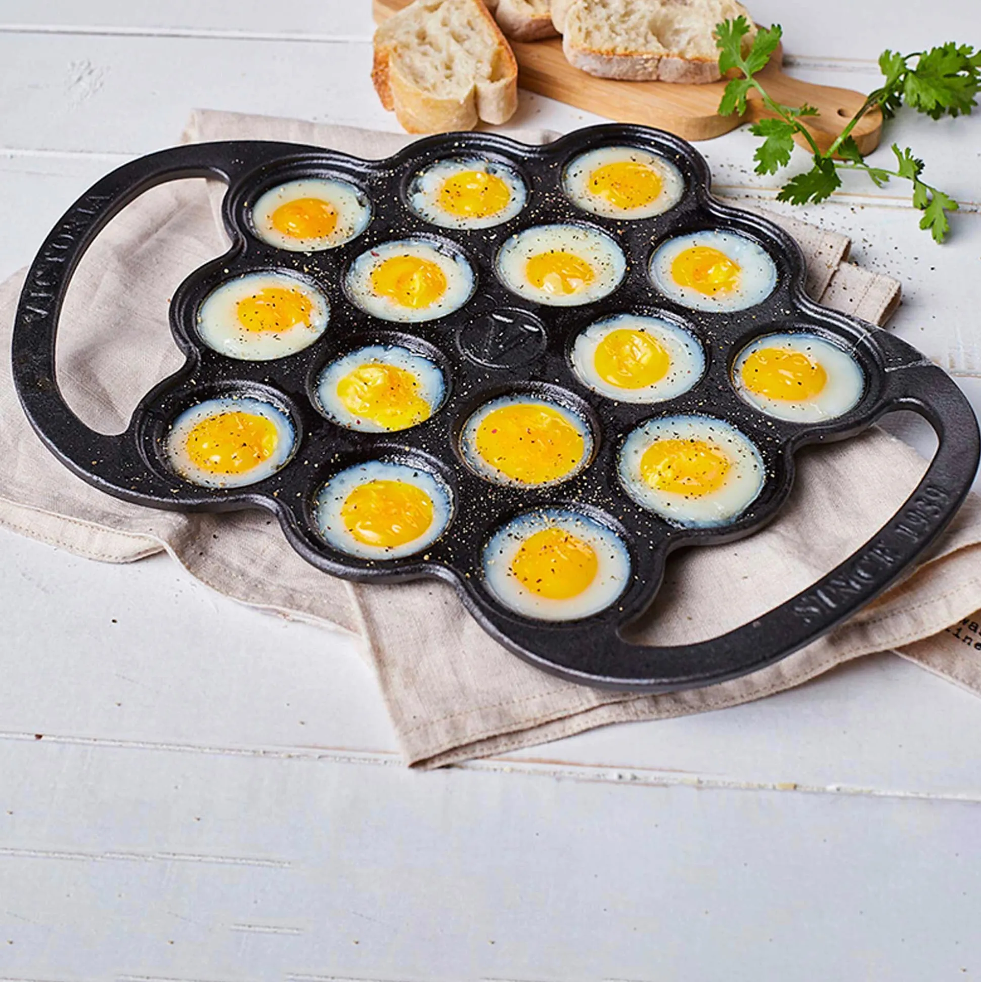 Gusseisen, mit Leinöl eingebrannt (Materialstärke 3,5 mm). Pfanne mit 15 Mulden à 4 cm Ø und 1 cm Tiefe. Randhöhe 1,8 cm. Länge 27 cm, Breite 20 cm. Gewicht 2 kg.