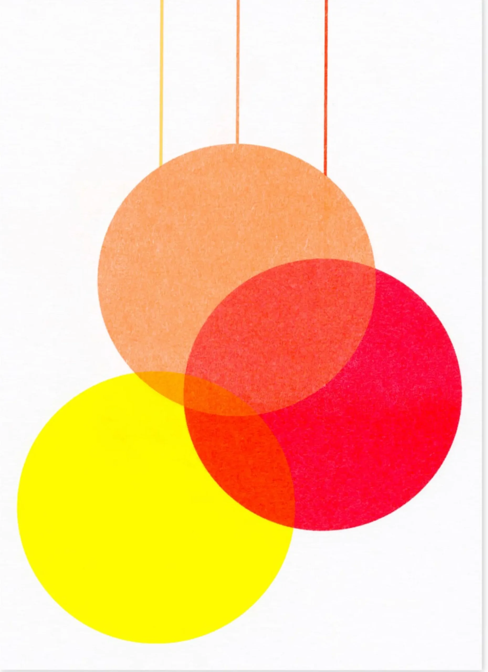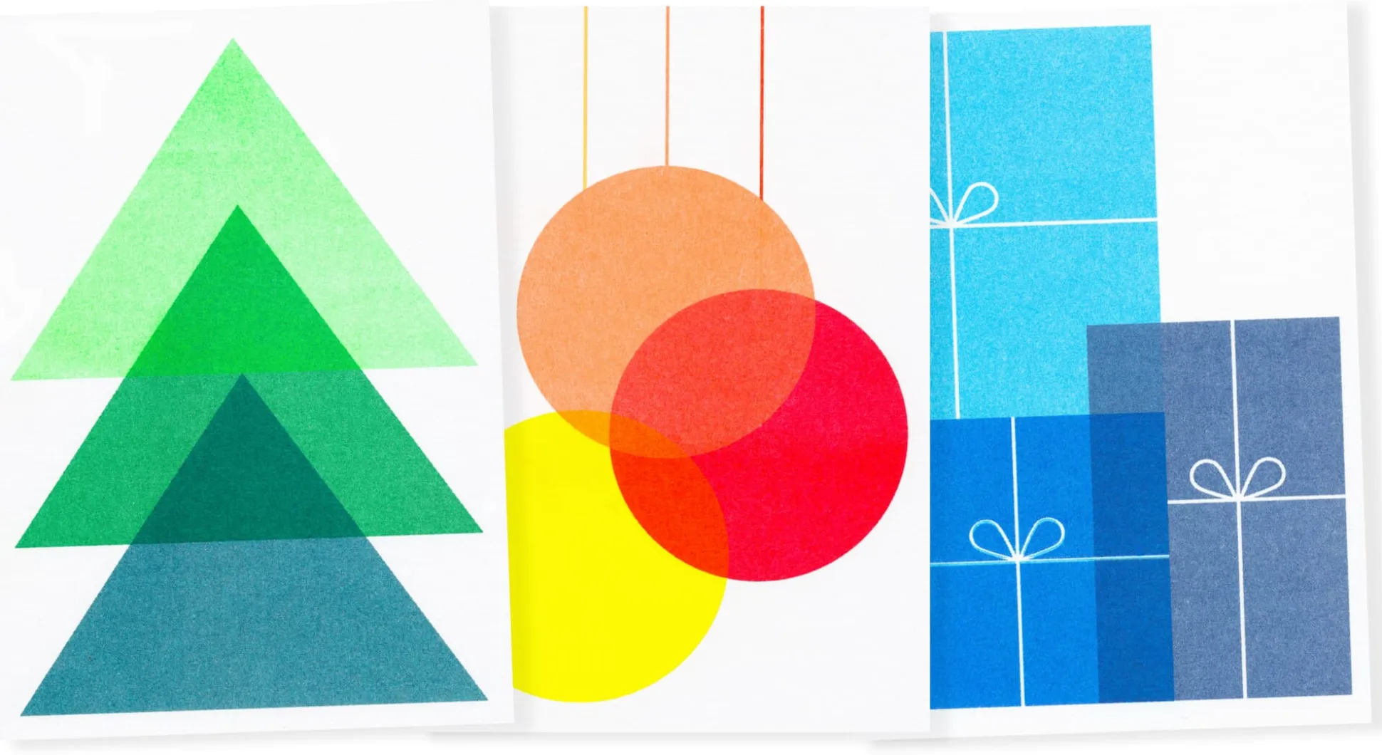 Im Risographie-Verfahren und auf hochwertigem Munken-Papier gedruckt, wirken die Farben und Motive fast plastisch. Das hochwertige, ungestrichende Papier und die prägnanten Farbstellungen machen die Grußkarten gleichermaßen zum grafischen Objekt – für das Konglomerat auf der Bilderleiste oder einzeln im Rahmen.