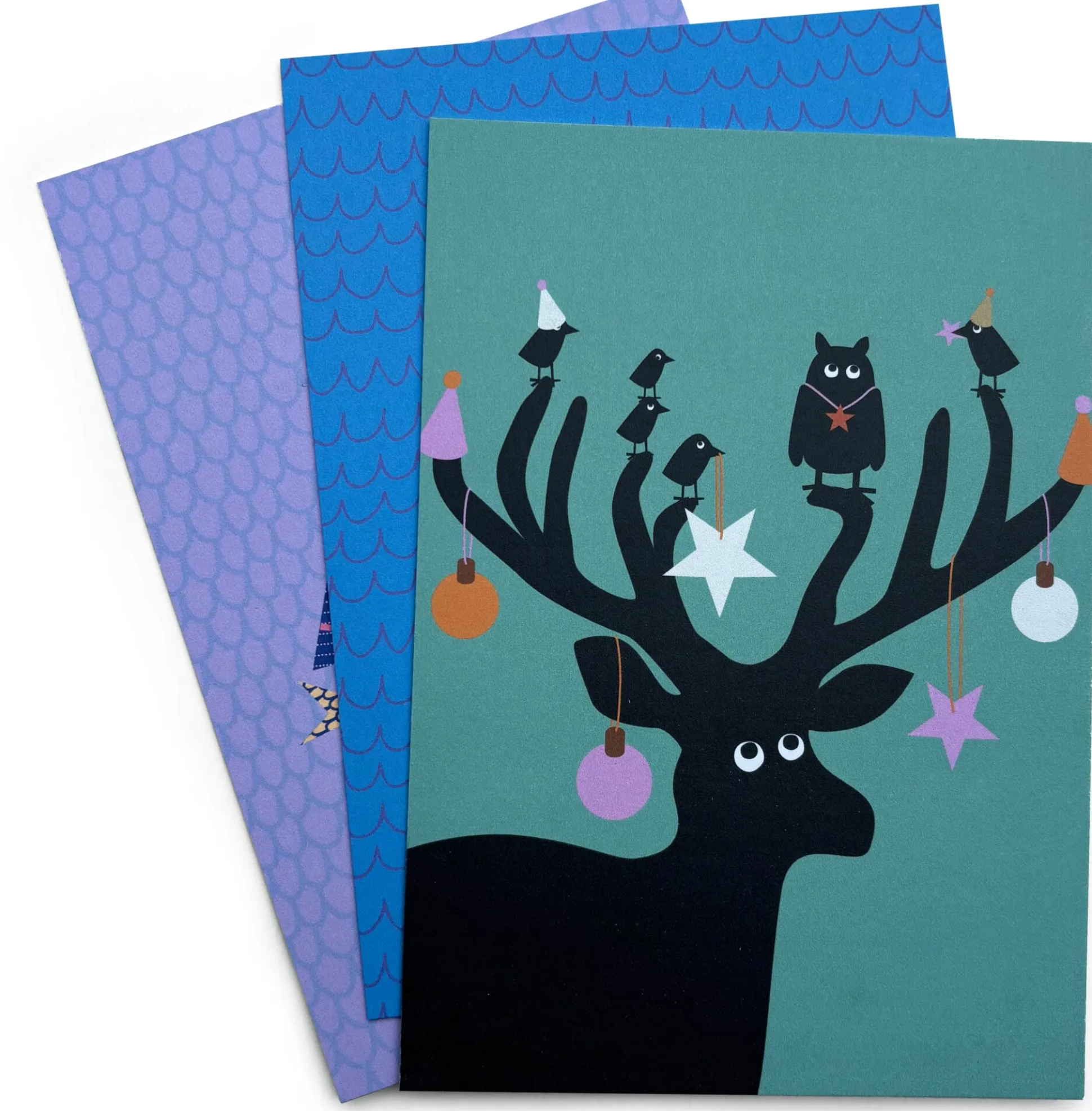Tierische Weihnachtskarten im Dreierset. Pinguin, Octopus und Hirsch grüßen zum Fest und bringen Weihnachtskugeln, Kerzen und Geschenke mit. Die freundlich-humorvollen Motive sind hochwertig auf 350 g-Karton gedruckt und machen sich auf der Bilderleiste und im Regal ebenso gut wie im Briefkasten.