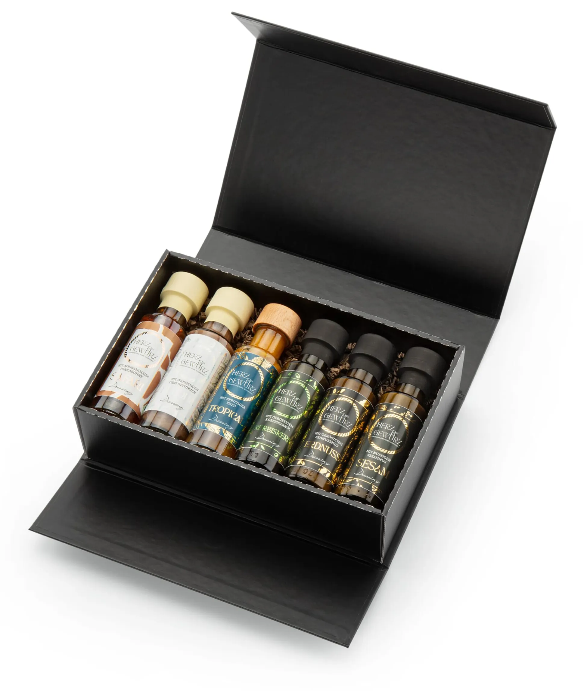 Dieses Probierset zeigt die ganze Geschmackspalette, die Herz & Gewürz bei seinen Produkten bietet. Es enthält je eine kleine Flasche Safari-, Buddha-, Tropical-, Kürbiskern-, Erdnuss- und Sesamdressing.