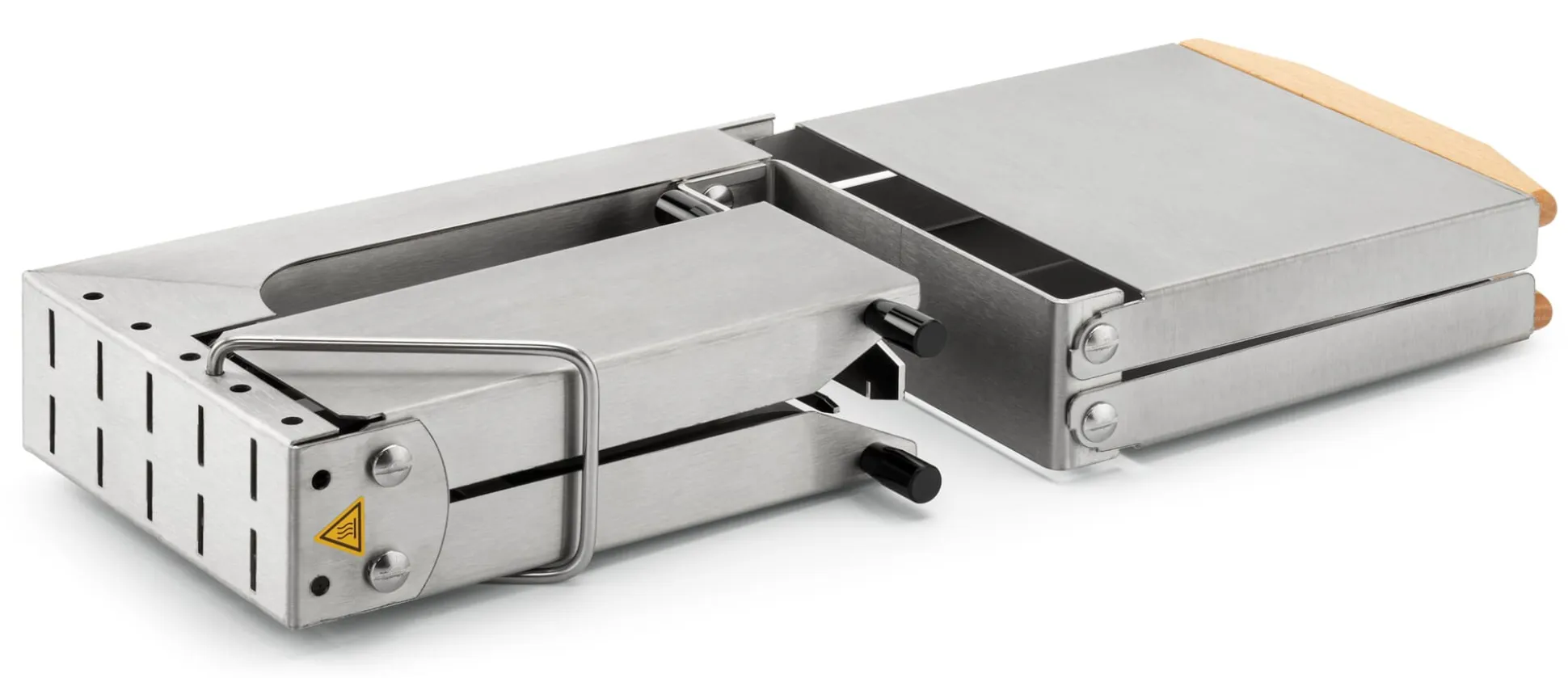 Edelstahlkorpus mit Knöpfen aus Kunststoff und Buchenholz. Käsesitz 19,5 × 17 cm. Aufgestellt H 30 × B 45 × T 19,5 cm, zusammengeklappt H 49,5 × B 20 × T 7 cm. Leistungsaufnahme 900 W. Schutzkontaktstecker. Gesamtgewicht 3,4 kg. Aufheizzeit ca. 10 Minuten.