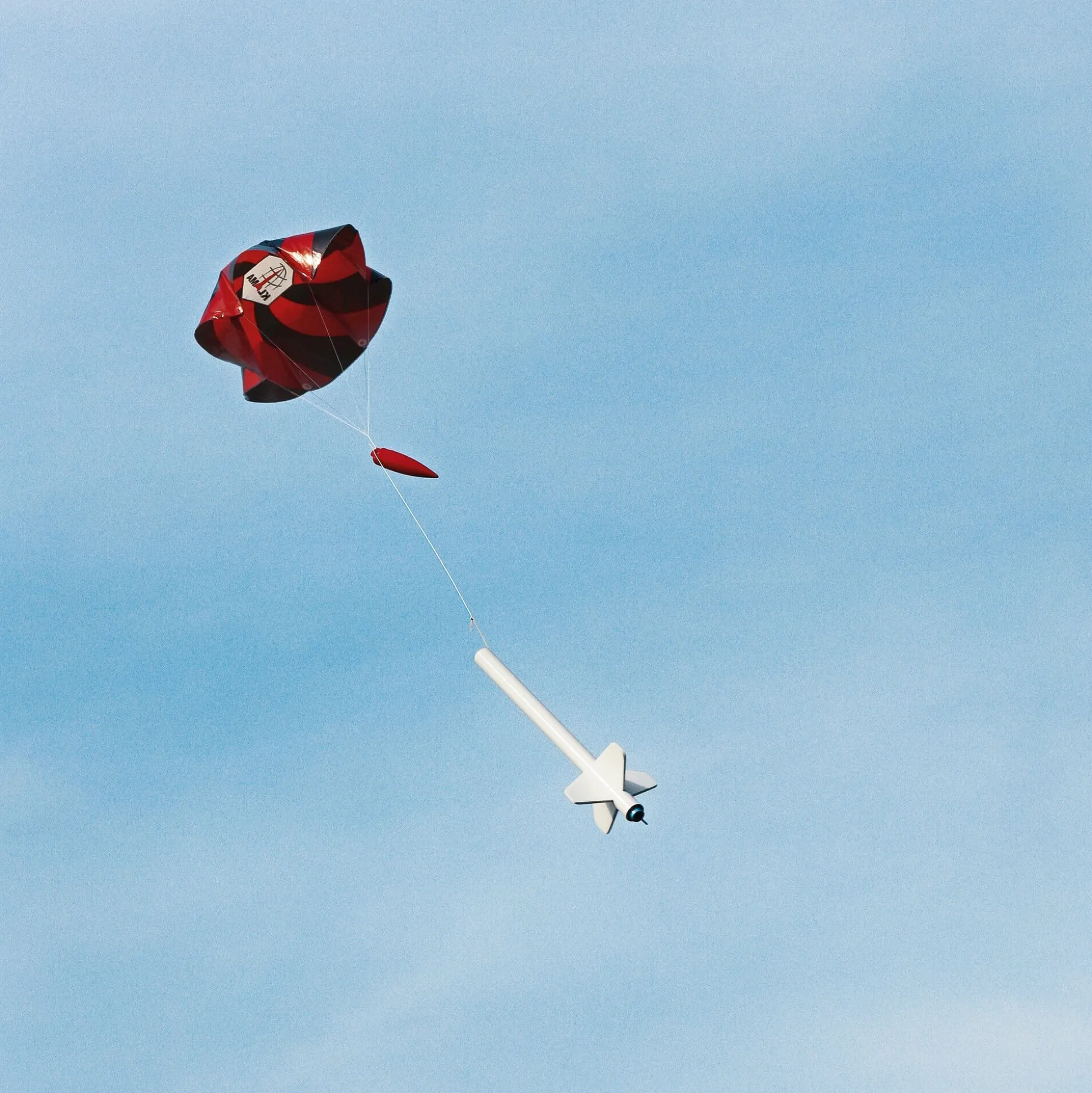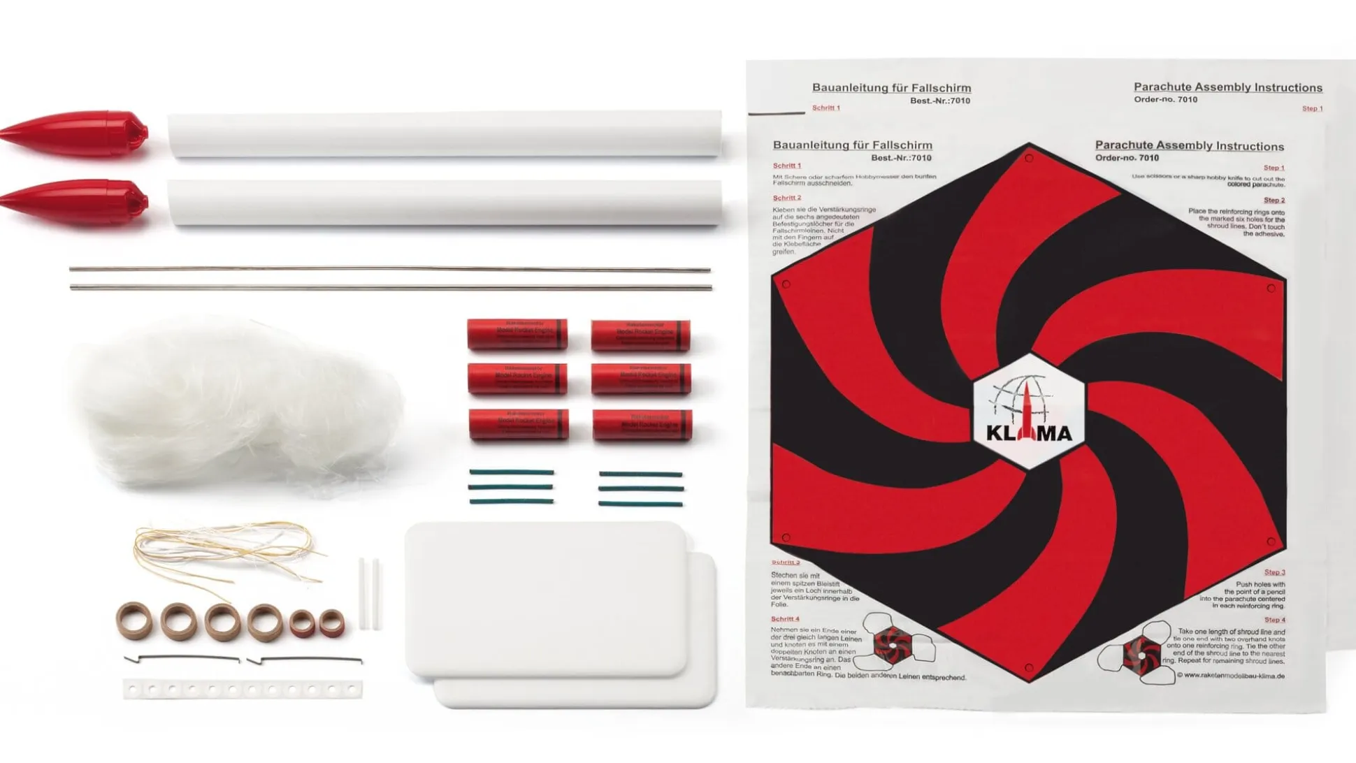 Leitwerke Polystyrol, Raketenspitze und Fallschirm PE, Raketenrohr Karton, Schnur Aramid, Stäbe Edelstahl. Mit Raketenschutzwatte und 6 Raketentreibsätzen A-Motor.
