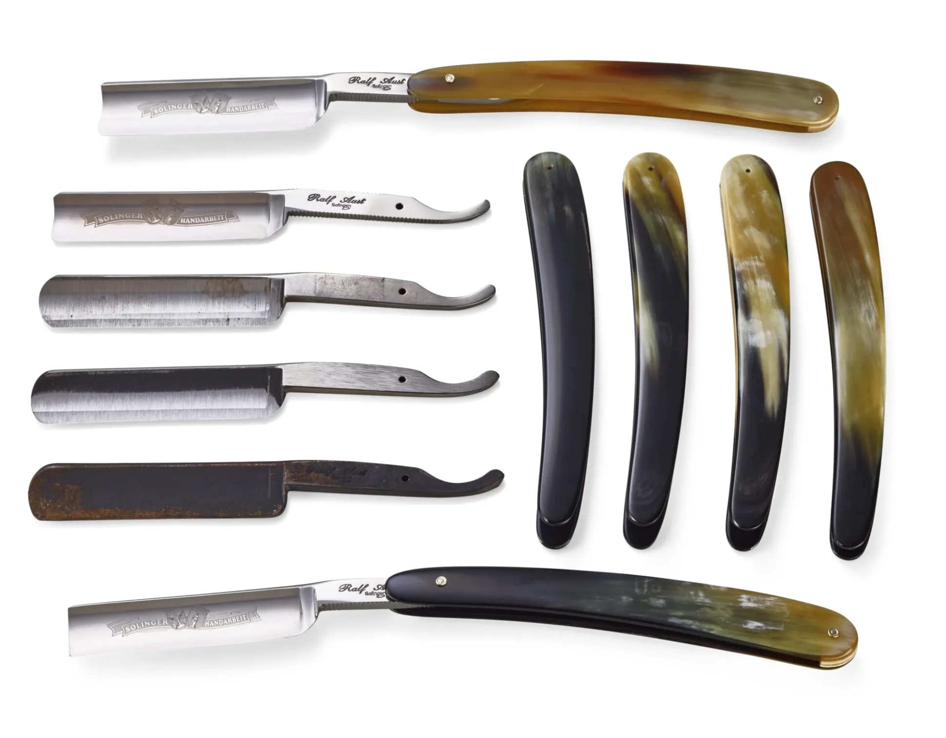 Die Rasiermesser von Ralf Aust sind in unterschiedlichen Breiten und mit verschiedenen Köpfen erhältlich. Breite Klingen (zum Beispiel 6/8″) sind etwas schwerer und lassen sich gut führen, sind daher für Anfänger die erste Wahl. Je schmaler die Klinge, desto wendiger und direkter in der Führung ist sie, aber auch umso anspruchsvoller in der Handhabung, vor allem wenn sie mit geradem Kopf gearbeitet ist.