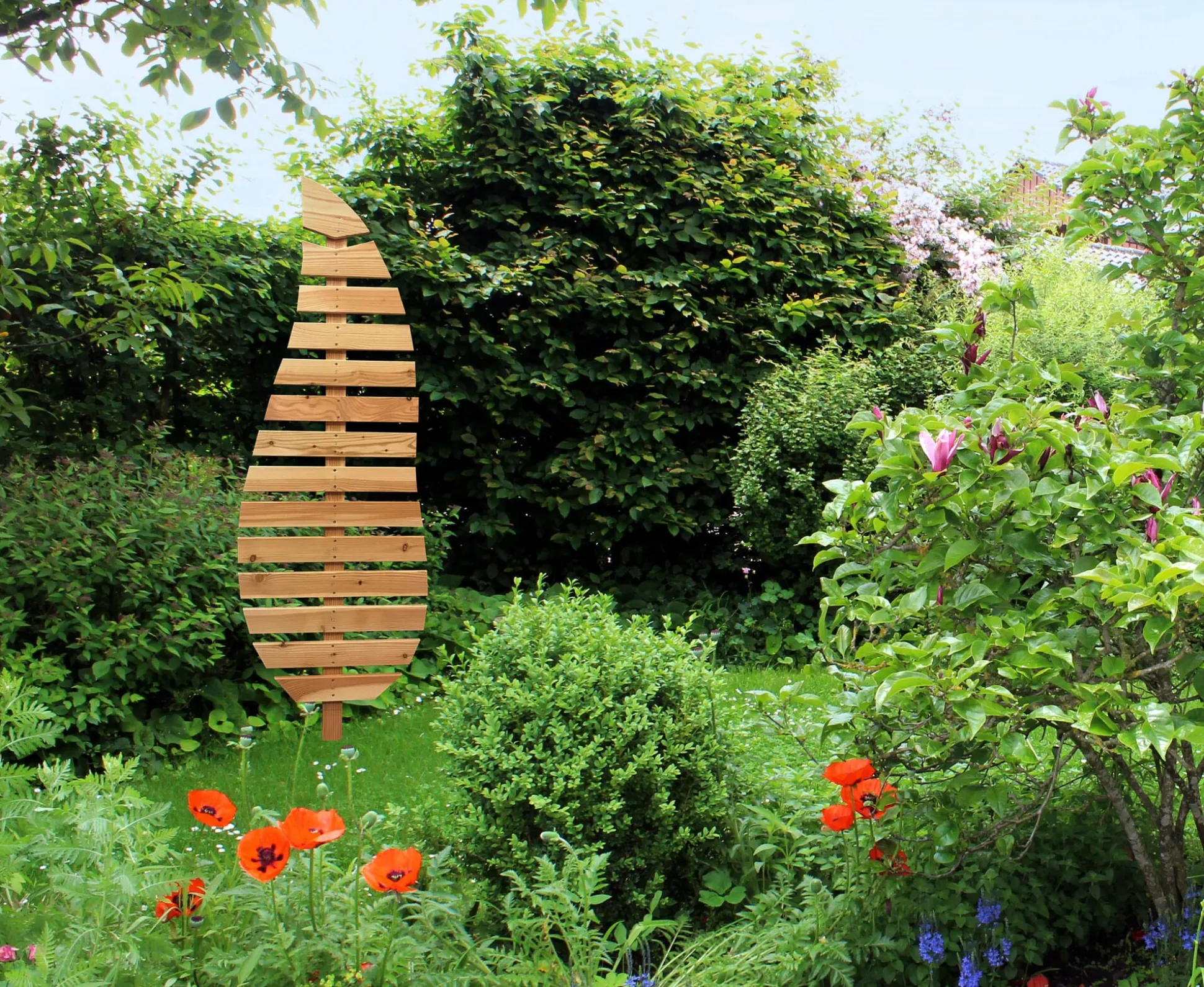 Zurückhaltend und harmonisch fügt sich dieses Gebilde in die gewachsene Gartennatur ein. Rankhilfe und Dekorationsobjekt in einem, findet seine natürliche Blattform gleichermaßen in penibel aufgeräumten wie in naturnah gestalteten, in großen wie in kleineren Gärten ihren angestammten Platz. Schmückend wirkt das Rankobjekt aus dauerhaft witterungsbeständigem Lärchenholz das ganze Jahr über – im Herbst und Winter, wenn die Beete kahl erscheinen, ebenso wie im Frühling und Sommer, wenn Kapuzinerkresse, Prunkwinde, Kletterndes Löwenmäulchen oder Duftwicke daran emporwachsen und ihren bunten Blütenzauber entfalten.