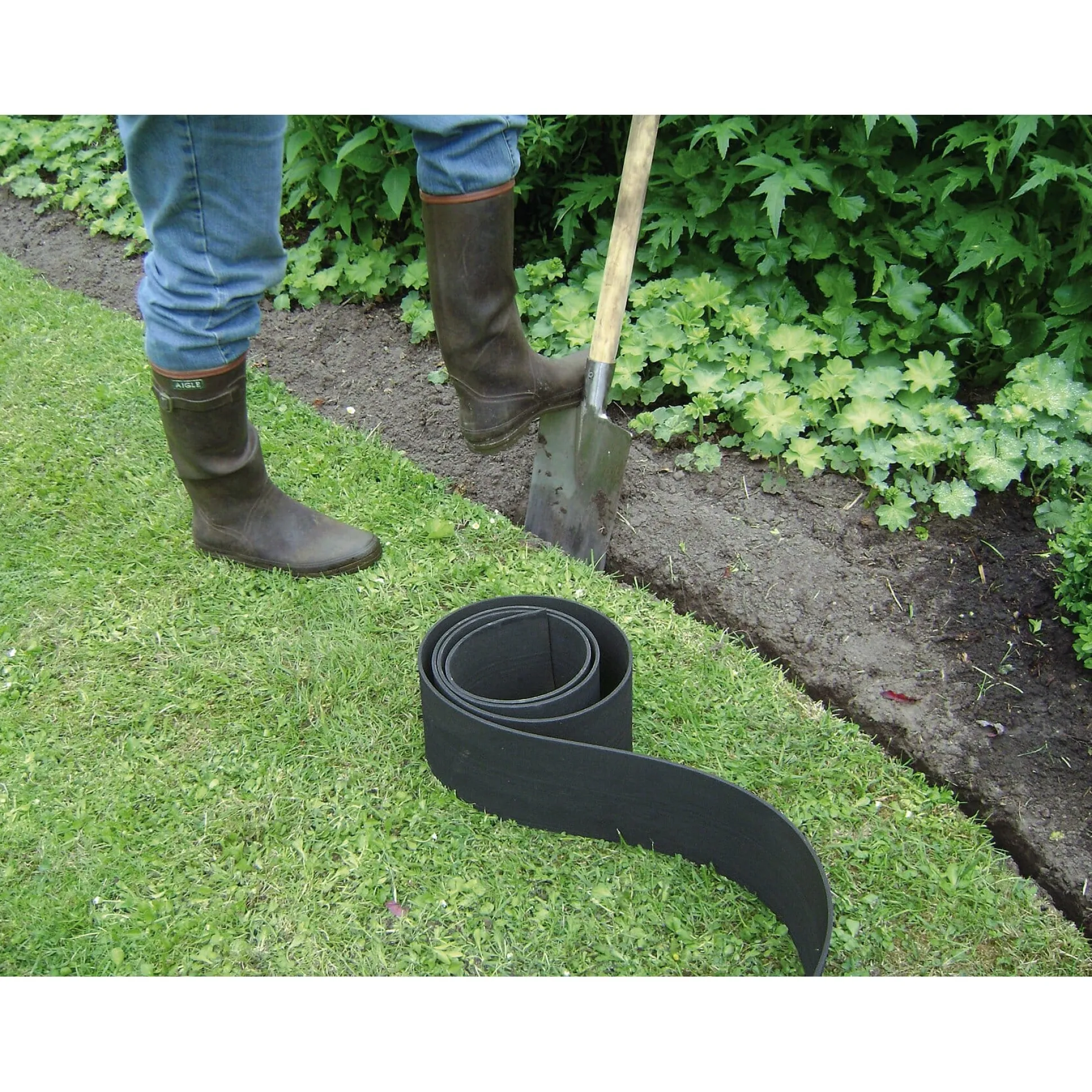 Zwischen Rasen- und Beetflächen in den Boden gegraben, trennt diese Rasenkante, hergestellt aus Gummi (recycelt), unterschiedliche Gartenbereiche wirkungsvoll voneinander. Zu diesem Zweck können Sie das 3 mm starke, elastische Band vor dem „Verlegen“ sogar zuschneiden – das geht ganz einfach mit einer entsprechend starken Schere. Das robuste Material der Rasenkante ist sehr langlebig und widerstandsfähig gegen Bewitterung und mechanische Belastung – ein unsanfter Tritt mit dem Arbeitsschuh oder das Überfahren mit der beladenen Schubkarre werden ihm nichts anhaben können. Beachten Sie bitte: Die Kante ist nicht geeignet für den Ausgleich von Höhenunterschieden zwischen verschiedenen Flächen.