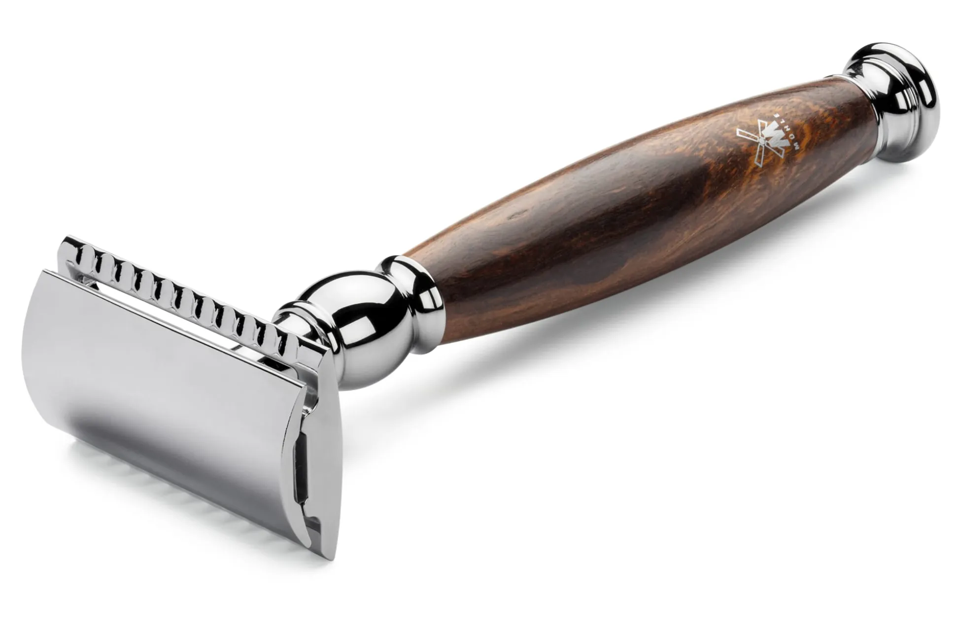 Die Form dieser Rasierhobel von Mühle orientiert sich an der klassischen Gestalt, mit einem etwas längeren Griff und geschlossenem Kamm. Sie sind in drei Teile zerlegbar, lassen sich daher sehr gut reinigen. Kamm und Deckel sind aus Zinkdruckguss gefertigt, der Griff wahlweise aus Eisenholz, Kunstharz oder Porzellan, jeweils mit einem Endstück aus verchromtem Messing. Mit einer Klinge. Die jeweils passenden Rasierpinsel, mit feinem Silberspitz-Dachszupf besetzt, finden Sie ebenfalls in unserem Sortiment.