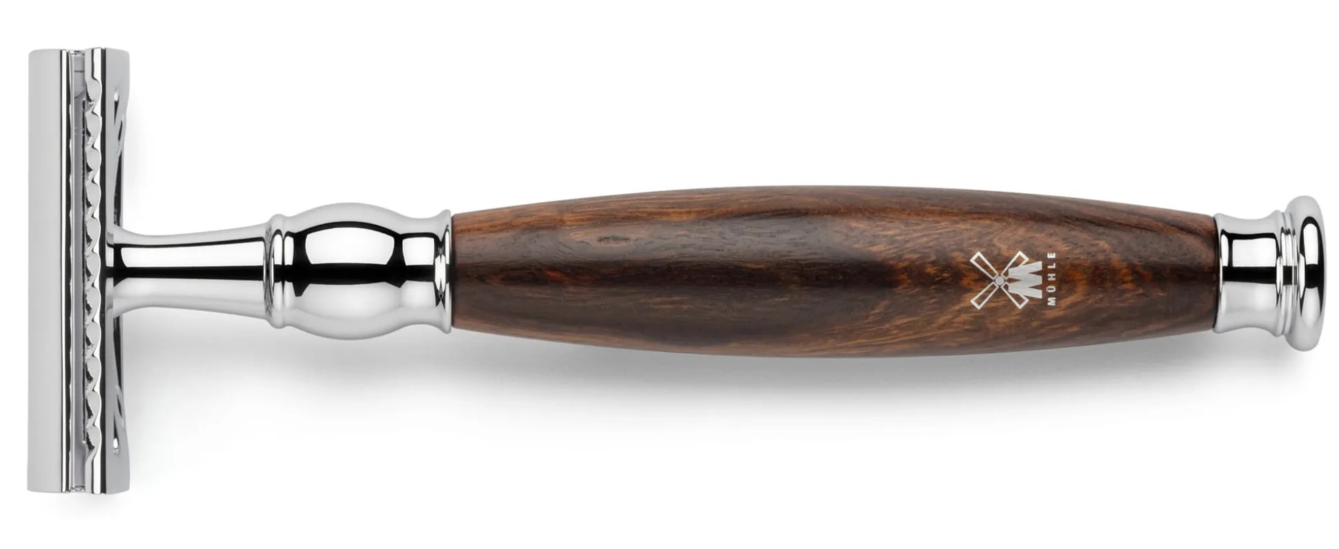 Der Griff ist aus sogenanntem Eisenholz gefertigt, das diesen Namen aus gutem Grund trägt. Wegen seiner extremen Härte und Dichte ist es äußerst beständig, zäh und widerstandsfähig, somit besonders für Griffe geeignet und für den Einsatz in Bereichen, in denen viel mit Wasser hantiert wird. Als Eisenholz werden verschiedene harte Hölzer bezeichnet. Das Eisenholz für diesen Rasierhobelgriff stammt von Olneya-Bäumen in der Sonora-Wüste in Arizona und wird deshalb auch Wüsteneisenholz genannt. Wegen des geringen Bestands dieser Baumart wird ausschließlich das Holz bereits abgestorbener Bäume verwendet. Seine seidig-glänzend polierte Oberfläche bringt den tiefbraunen Farbton und die feine Maserung besonders gut zur Geltung.